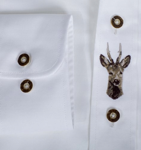 елегантна та ексклюзивна чоловіча біла сорочка, виготовлена в 100% бавовни. На пільвах вишита голова рогак, , поки кнопки завдяки імітації рогів роблять цю сорочку, вона стає унікальною і в той же час отримує мисливський персонаж. Сорочка підходить до чудових зустрічей серед друзів та компанії колег мисливців.