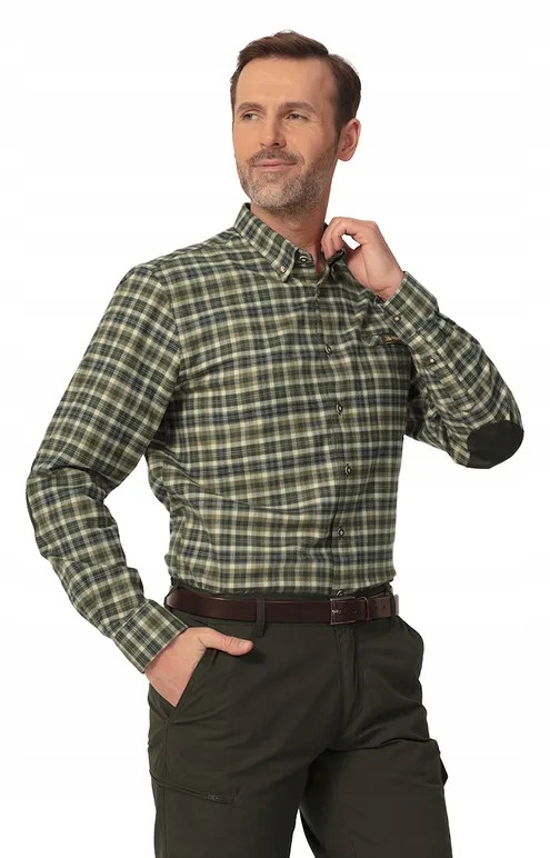 Чоловіча сорочка м'яка, міцна та приємна на дотик. Має класичний візерунок зеленого та бежева решітка. Ця сорочка має ґудзики, які завдяки імітації рогів роблять її унікальною і водночас мають мисливський характер, додатково є декоративні замшеві нашивки на ліктях. Комір застібається на гудзики, зліва на грудях є врізана кишеня з клапаном.