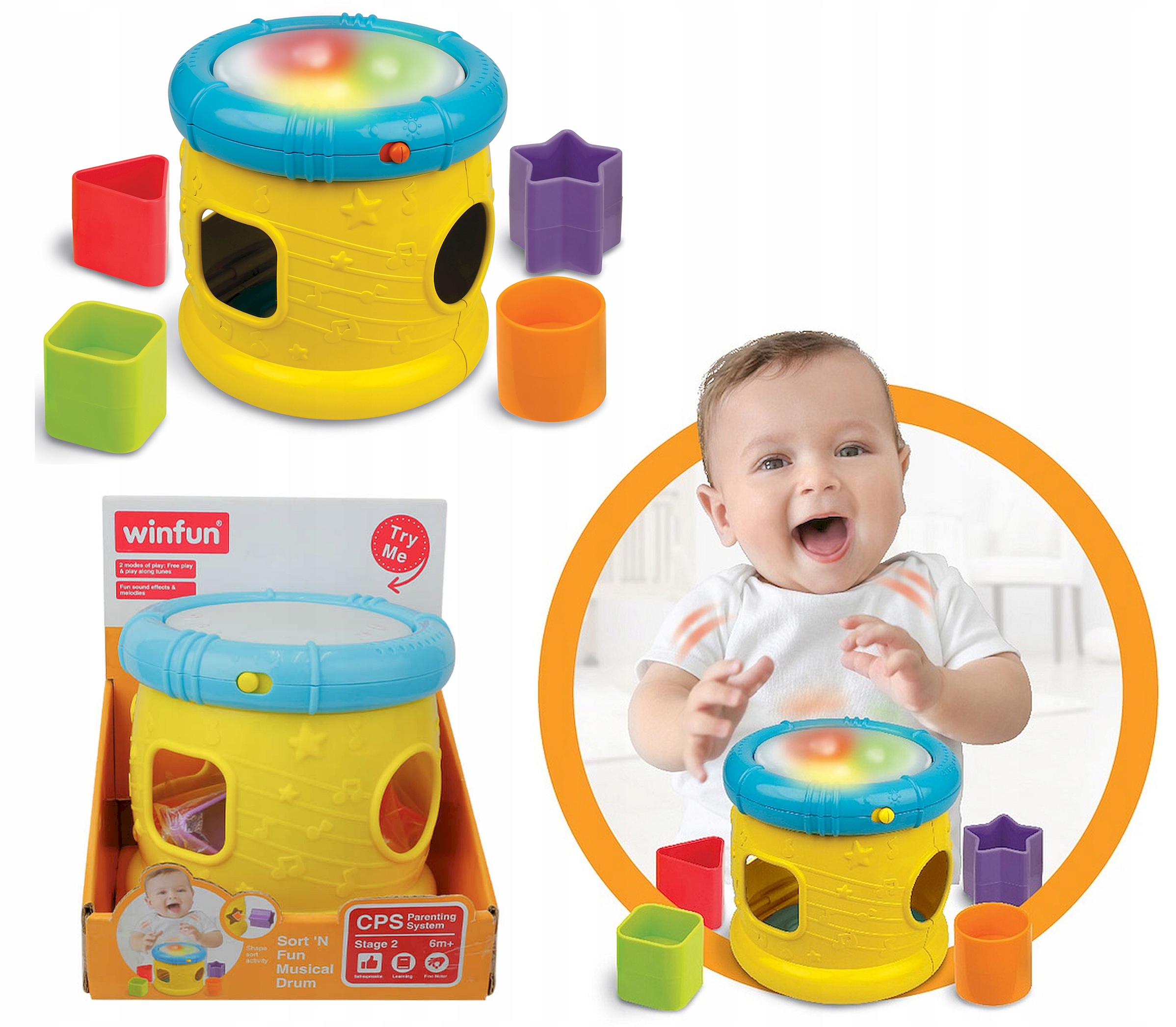 Сортковий сяючий барабан - це багатофункціональна іграшка. Він не лише сортувальник, але й барабан, де ви можете виграти будь -які ритми. Коли дитина потрапляє, іграшка з'єднується з власними звуками, музикантом з малюком. Він світить барвистими вогнями. Стіни мають отвори для сортування різноманітних форм.