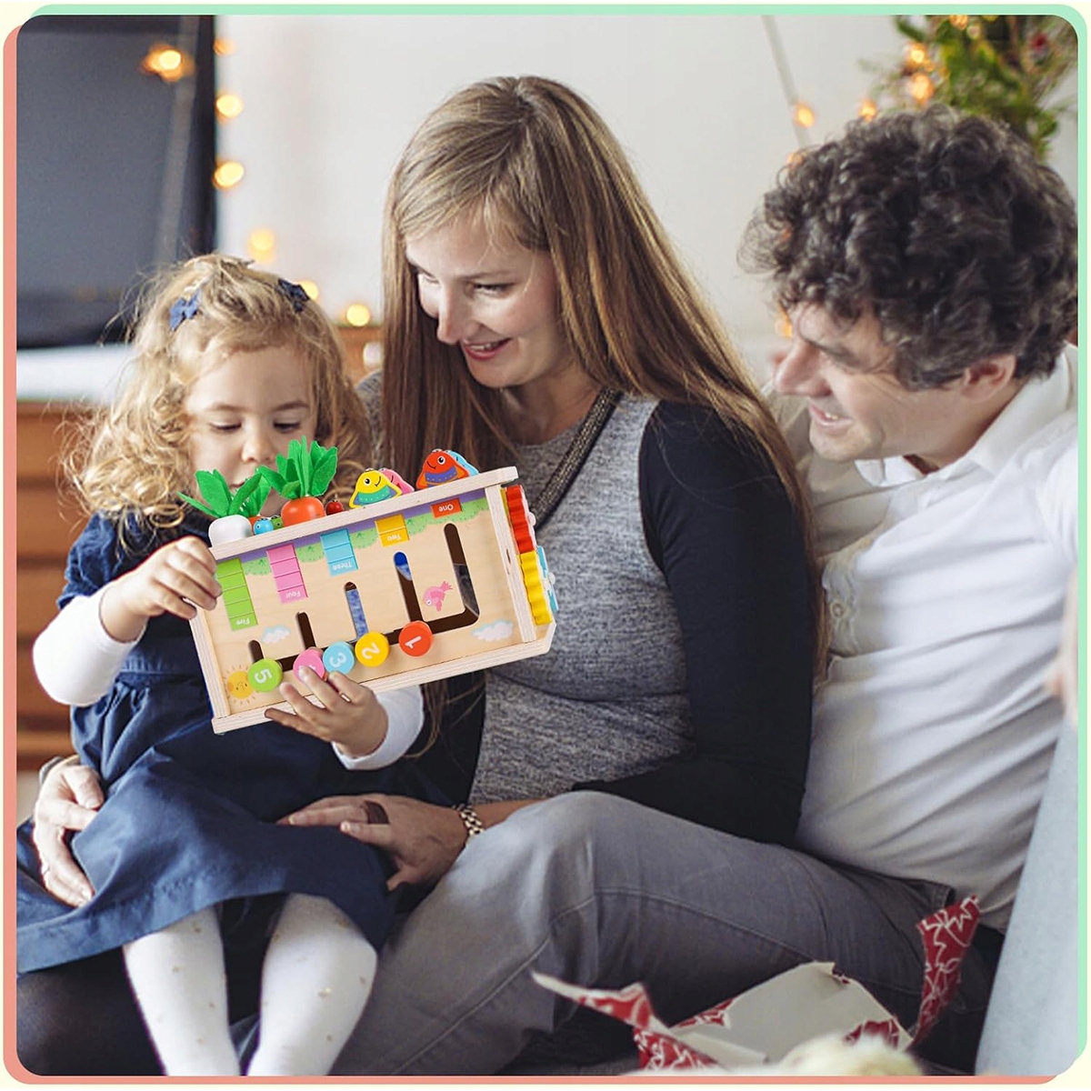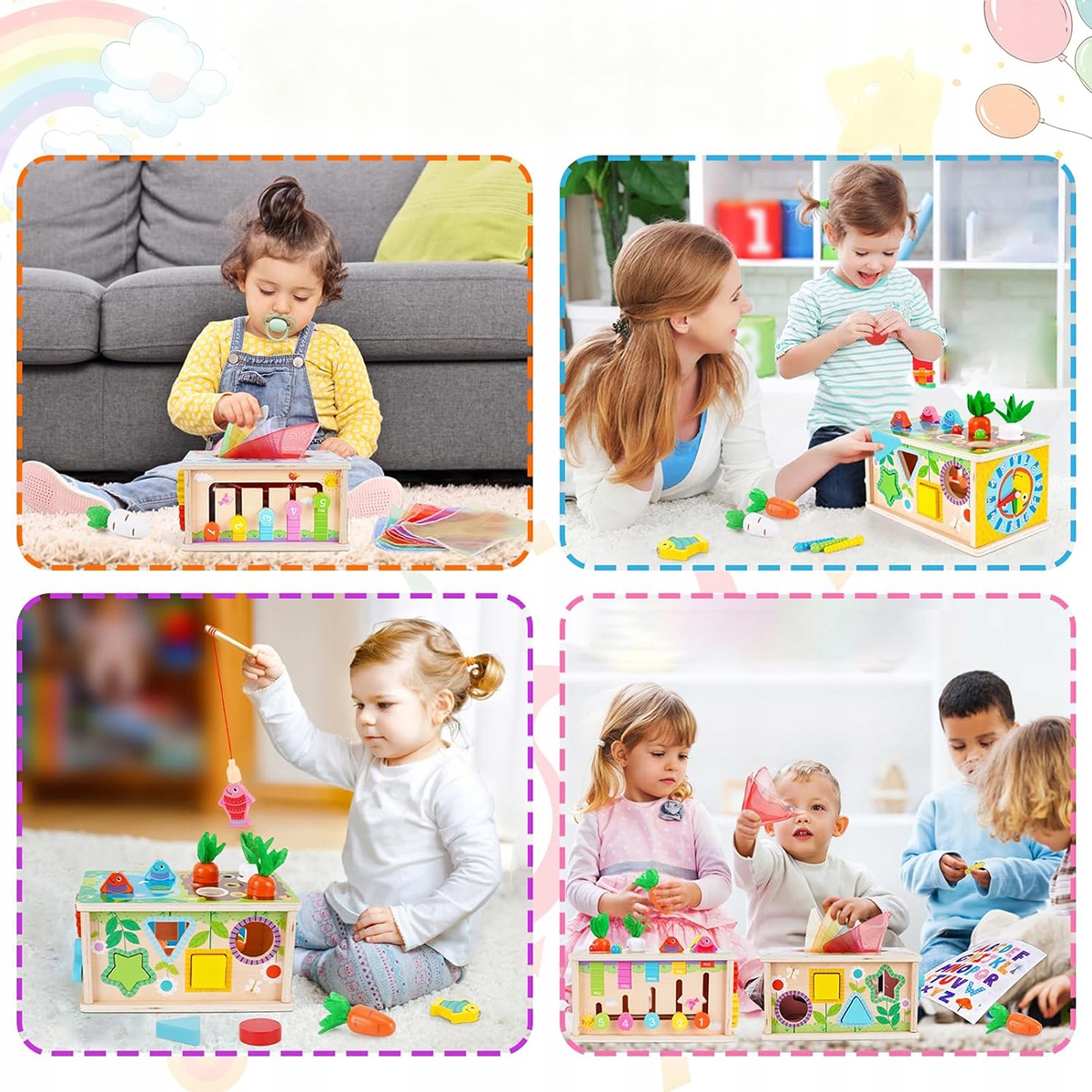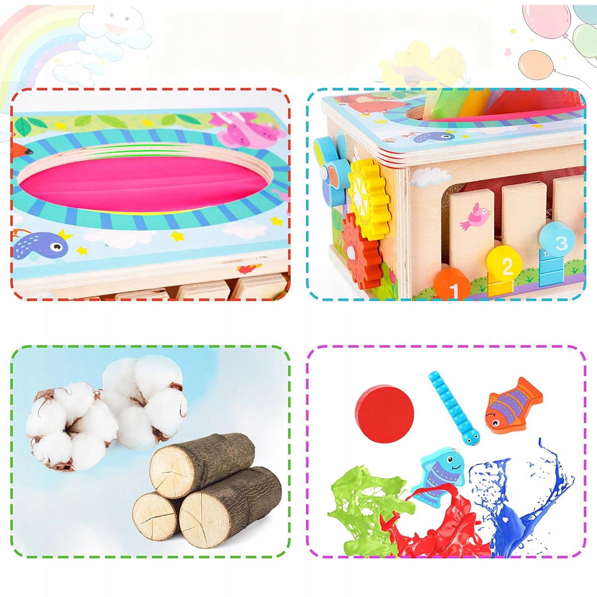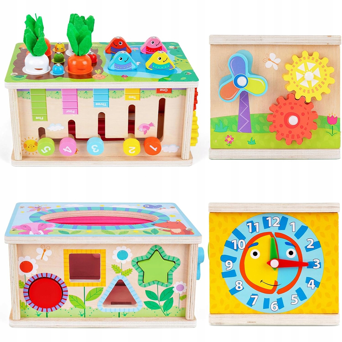 🍭 РОЗВАГИ 6-в-1 ДЛЯ МАЛЕНЬКИХ ДОСЛІДНИКІВ: від веселої коробочки для серветок до інтерактивного навчального годинника, обертових шестерень, сортувальника фігур, гри з морквою та рибкою та до захоплюючого лабіринту з числами – кожен елемент подарує вашій дитині години сміху та відкриттів.