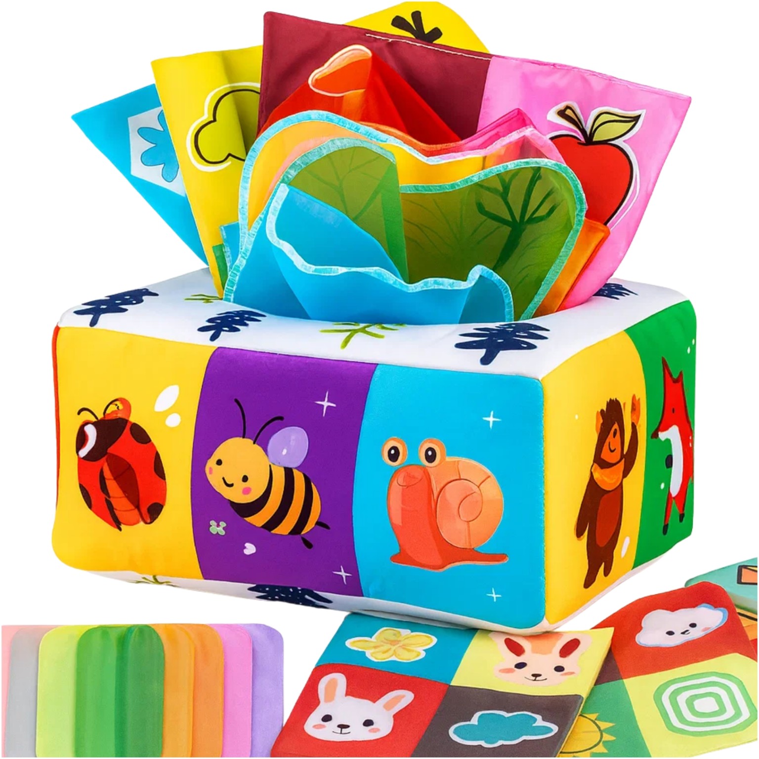 Завдяки різнокольоровим серветкам, м'якому матеріалу та милим тваринам іграшка надовго захоплює дитину та сприяє сенсорному розвитку.