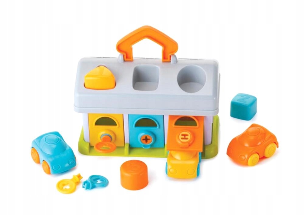 Гараж з автомобілями з функцією сортувальника. На даху гаража є 3 отвори різної форми, в які можна помістити різнокольорові блоки з цифрами. 3 відкриваються дверцята, які можна закрити відповідними ключами. У набір входять 3 різнокольорові машинки, 3 блоки та 3 ключі. Вік: 12M+