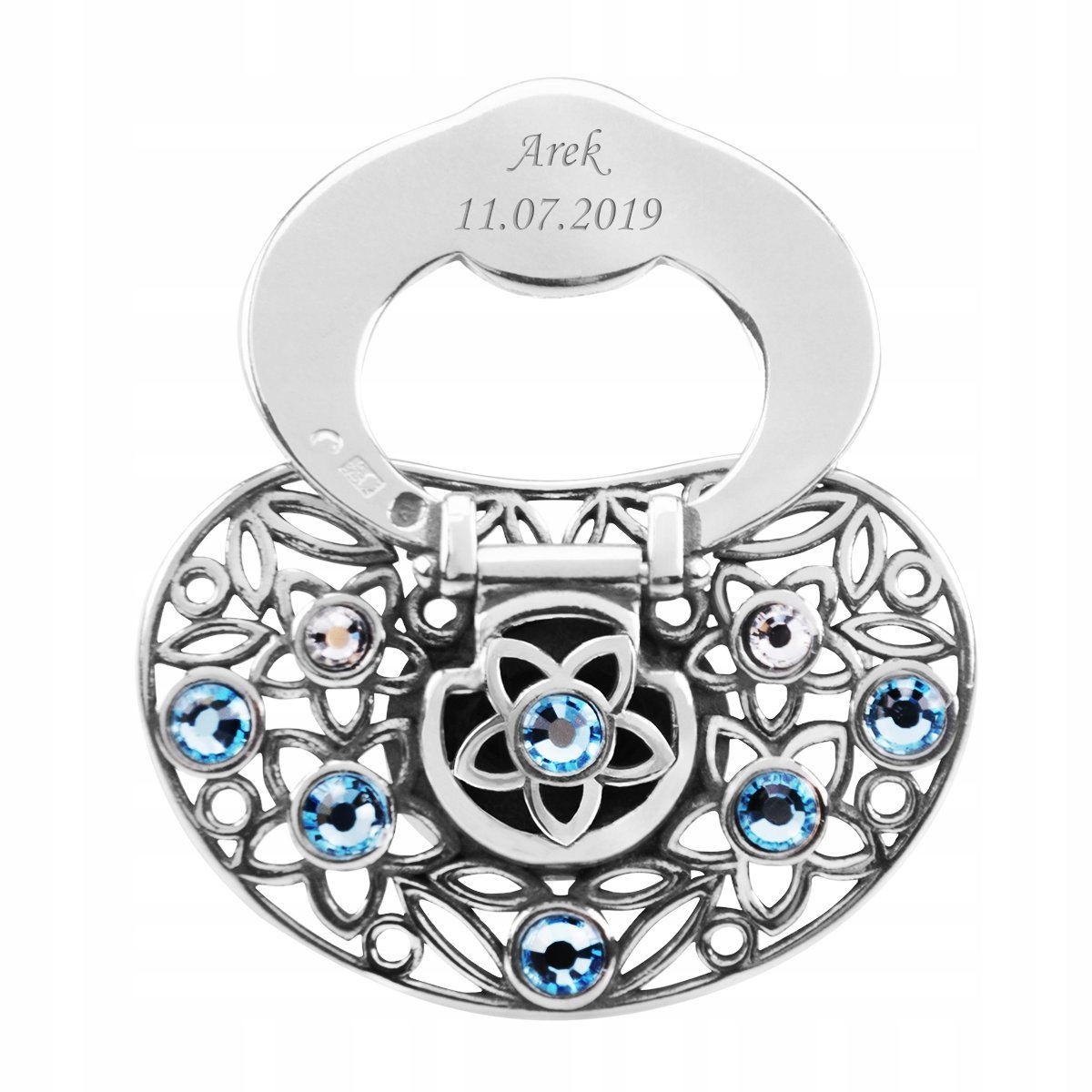 Пропонуємо вашій увазі красиву срібну пустушку з блакитними каменями. Є відділення в соску з "клапаном" для першого зуба. Красиво декоровані вироби з цирконами, листям і квітами.