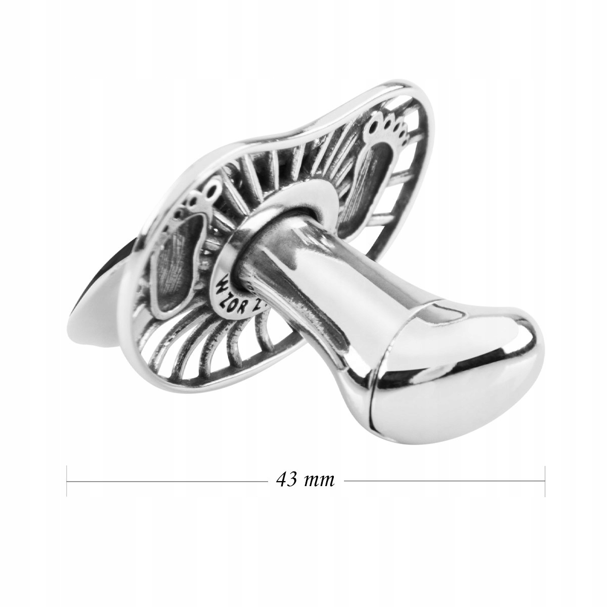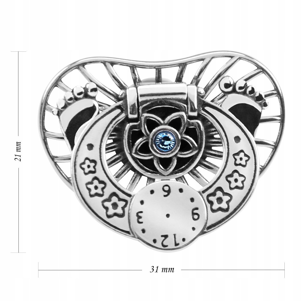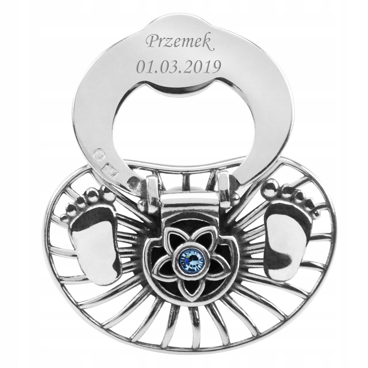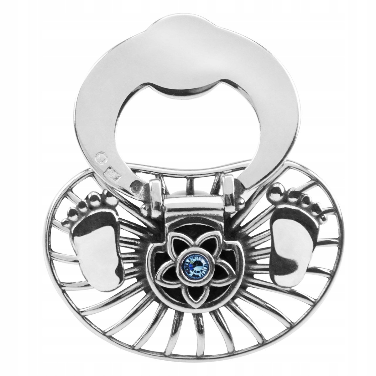 Ми пропонуємо вам красиву срібну пустушку з синім каменем і мотивом ніжки на кожній збоку. Пустушка має відділення з "клапаном" для першого зубика.