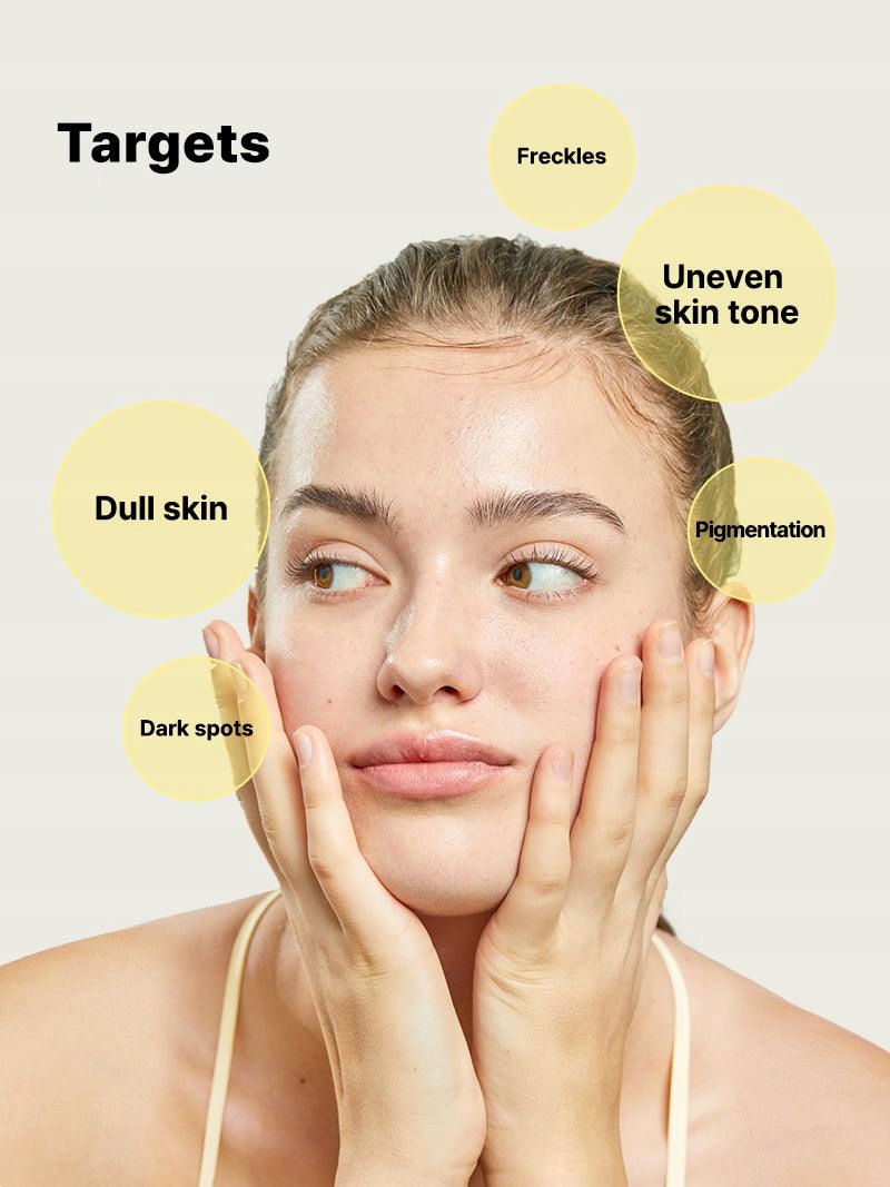Інгредієнти: Вода, Аскорбінова кислота (13%), бутиленгліколь, дипропіленгліколь, трометамін, 3-0-етил аскорбінова кислота, пантенол, ацетилглюкозамін, кофеїн, гіалуронат натрію, сульфіт натрію, динатрію ЕДТА, глутатіон, аденозин, екстракт плодів гарденії Флоридської, алантоїн, Декстрин, сквалан, токотрієноли, токоферол, олія Elaeis Guineensis (пальмова), аргінін, ніацинамід, пентиленгліколь, екстракт кореня Glycyrrhiza glabra (солодки).