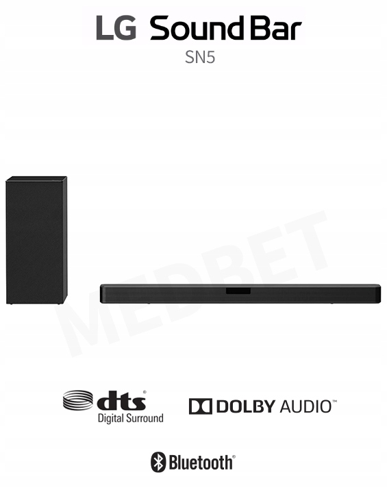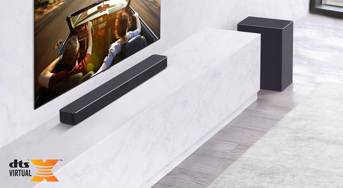 Саундбар LG SN5 із технологією DTS Virtual:X забезпечує винятково захоплюючий звук. Технологія DTS за допомогою трьох передніх динаміків і сабвуфера оточує користувача звуком з усіх боків.