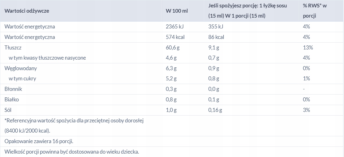 Інгредієнти: ріпакова олія, вода, овочі 9,9% (цибуля, огірок, червоний перець, часник), цукор, оцет, яєчний жовток, сіль, спеції (з гірчицею), кукурудзяний крохмаль, шніт-цибуля, ароматизатори, антиоксидант (динатрію кальцію EDTA)