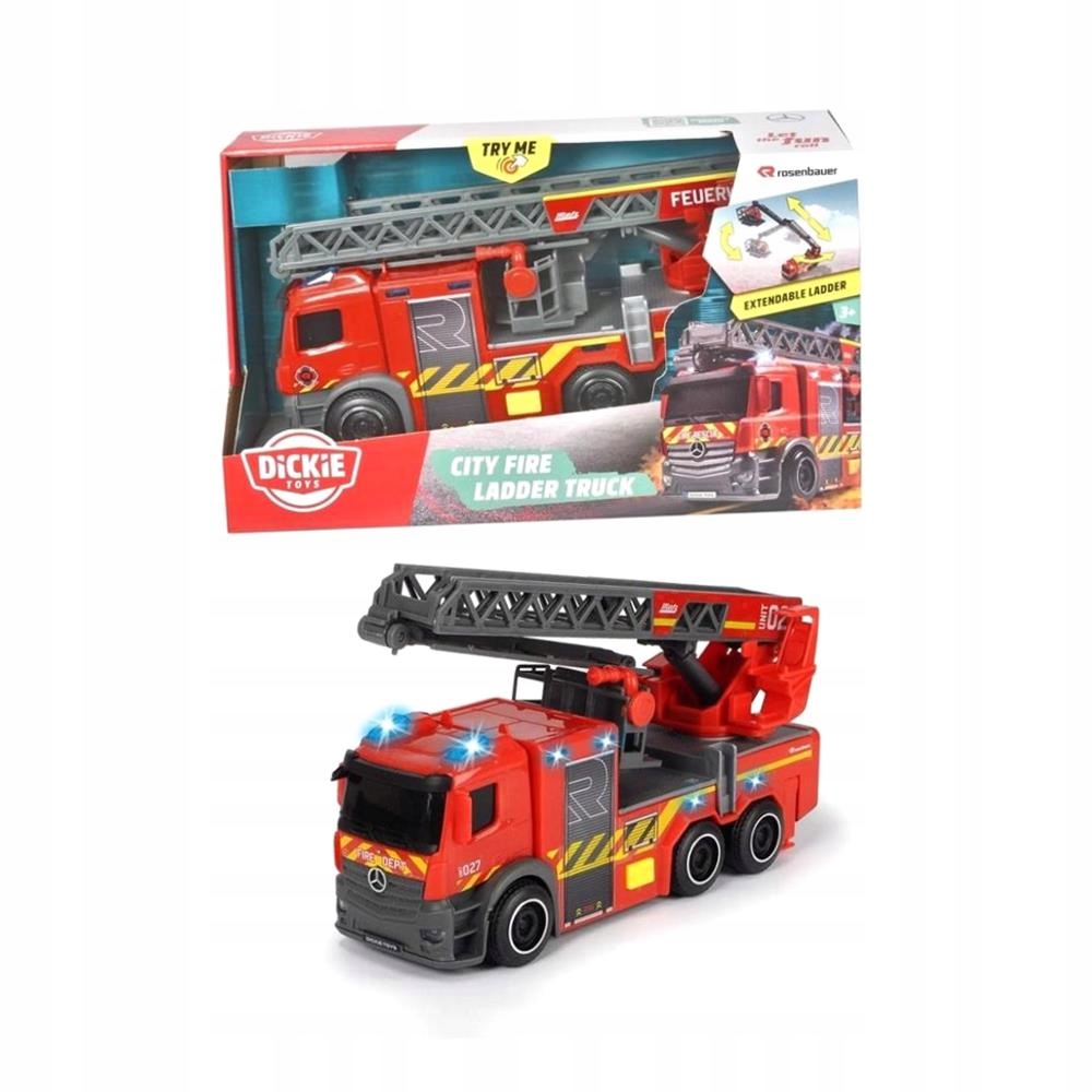 Пожежний автомобіль Rosenbauer з кабіною Mercedes-Benz. Щитка має світлозвукову функцію, рухомі елементи, висувну драбину та бічні опори. Автомобіль без приводу. Функція Try Me, 3 батарейки 1,5 В LR44 в комплекті. Польська версія. Довжина: 23 см.
