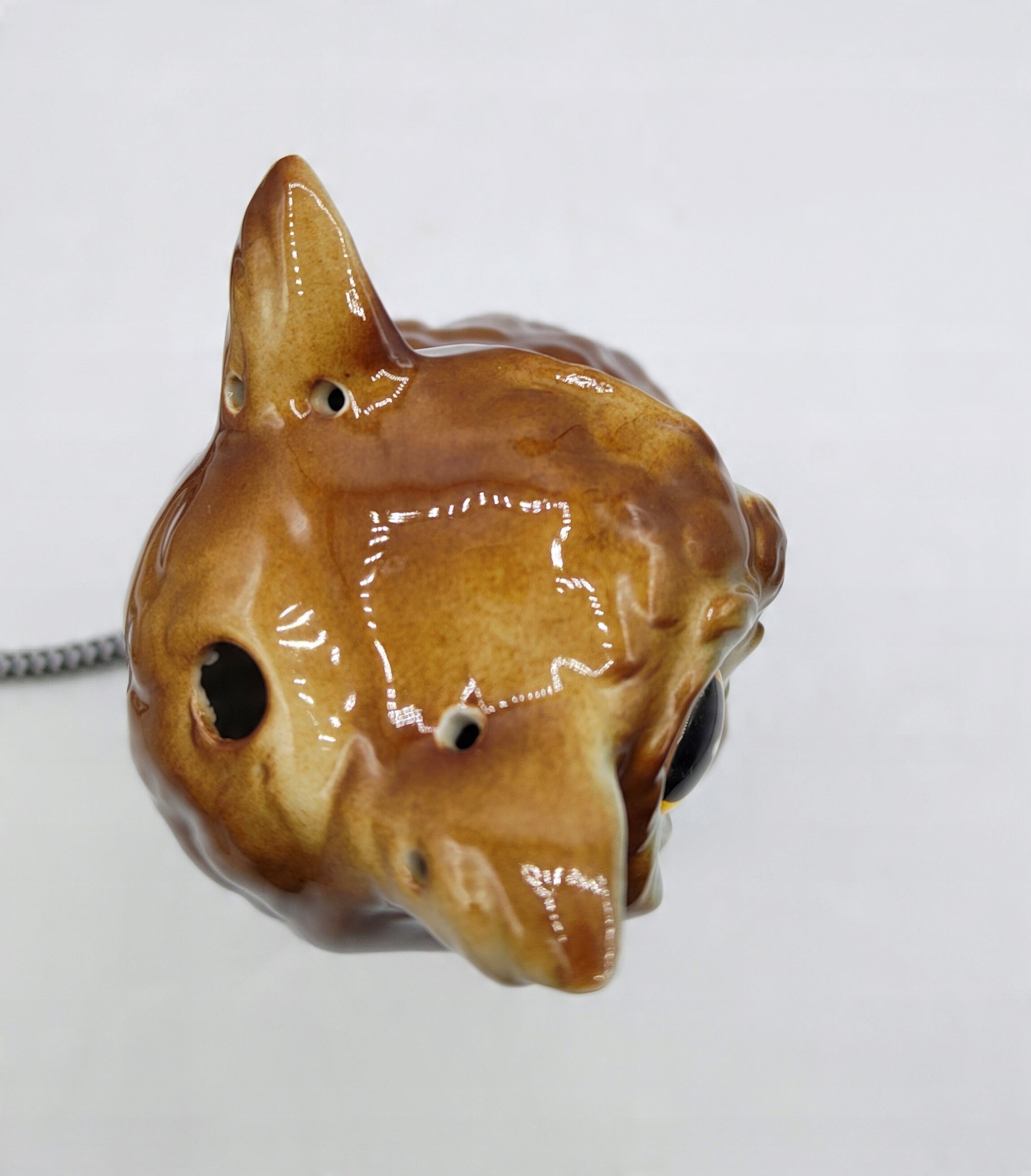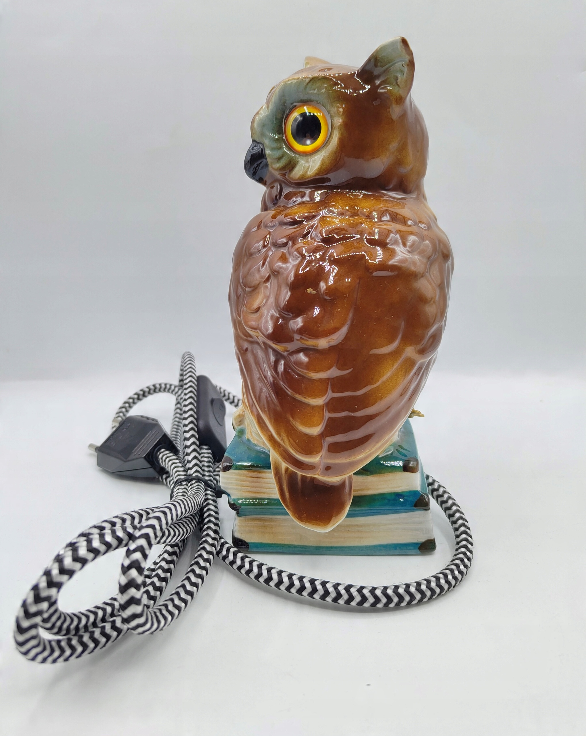 порцелянова сова, висота близько 20 см, ширина 11 см на 8 см. Вага понад 0,6 кг. Очі зроблені зі скла. 220 В живлення - нитка лампочки E14. Нова вставлена лампочка, що вставляла світлодіодна лампочка /я також додаю другу звичайну лампочку, яка стає гарячою і нагріває масло /. Новий прекрасний дріт у чорно -білій косі довжиною близько 170 см /попередня електрична установка, подрібнена з віком, був також старий плагін, який не відповідав сучасним розеткам - електрик замінив його на новий /. Сова також виглядає чудово, коли вона світить. Live виглядає так само красиво, як на знімках. У нього немає прихованих дефектів - дуже хороший, умову колектора. Рекомендую!