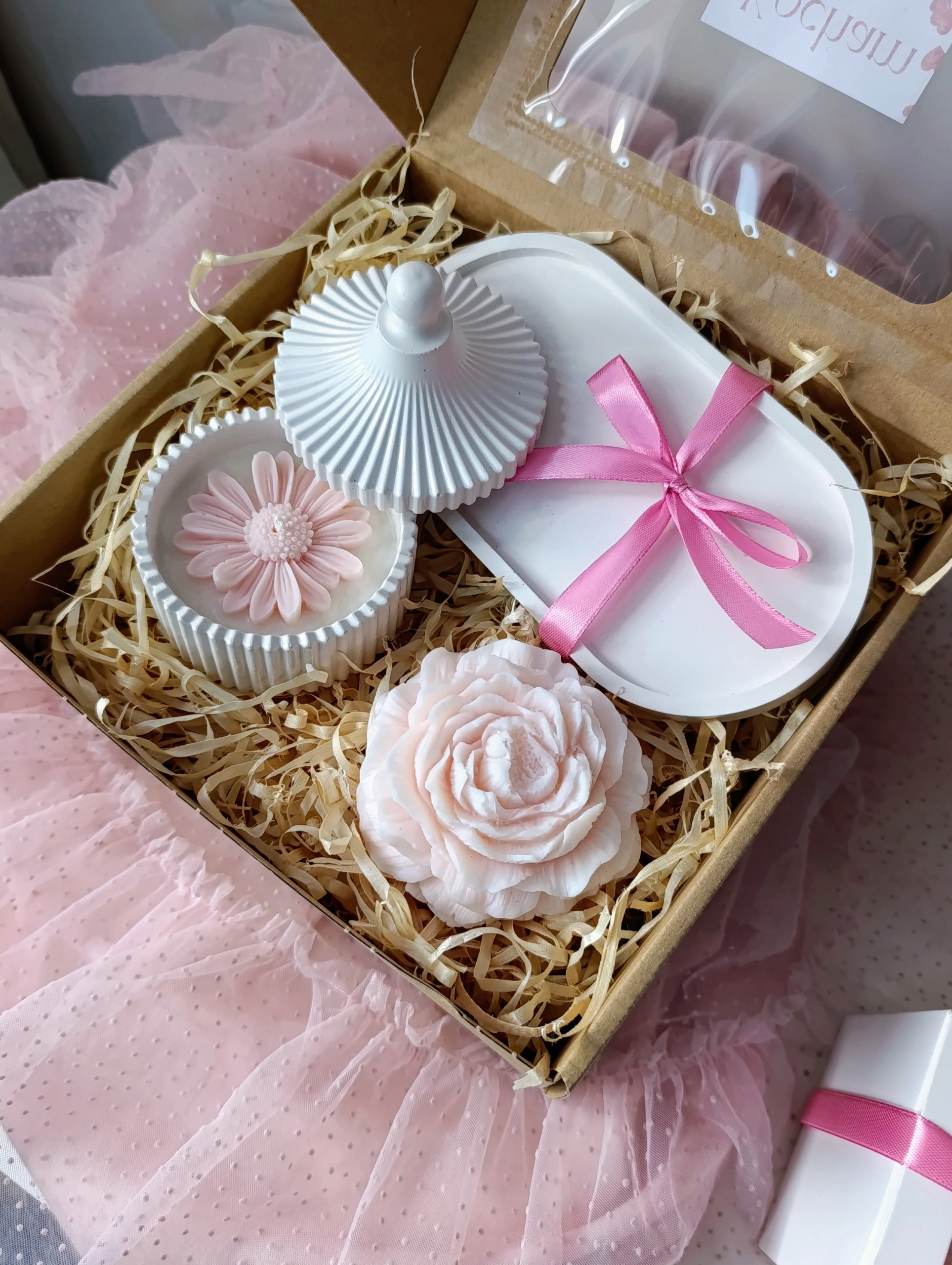 Подарунковий набір з 2 соєвих свічок і гіпсової основи. Свічка в коробці зверху прикрашена ромашкою з соєвого воску. Все це створює елегантну композицію, яка не тільки чудово пахне, але й чудово виглядає. І гіпсові зліпки, і свічки виготовлені нами вручну. Після того, як свічка згорить, коробку можна використовувати для зберігання дрібних предметів, а підставка ідеально підходить для, напр. окремо стоячі свічки. Набір упакований в різдвяну подарункову коробку з екологічним наповненням.