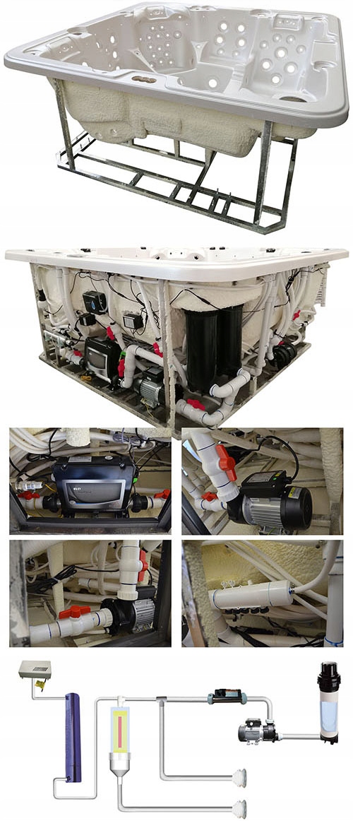 Конструкція виготовлена з нержавіючої сталі. Вся ванна базується на стійкій рамі з нержавіючої сталі, завдяки чому ванна має міцну та довговічну опорну основу, що дуже важливо для великих ванн. Вага таких SPA коливається від 250 кг до навіть 1500 кг у басейнах, і враховуючи вагу води та людей, вага є відносно великою та вимагає міцної опори, тому хороший дизайн ванни так важливий.