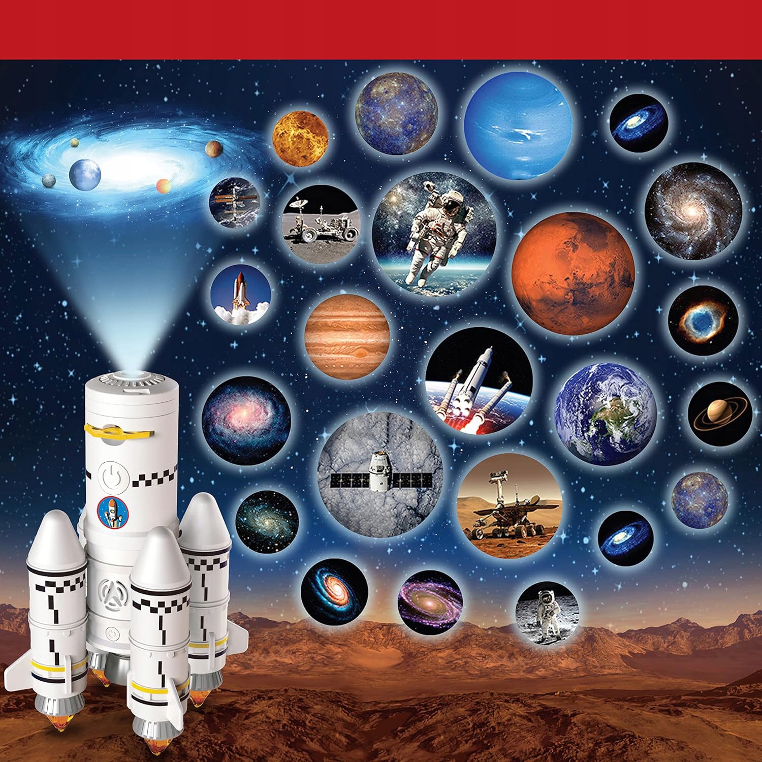 Ця супер крута ракета також є міні -проектором. Слайд -шоу з трьома мотивами: космос, галактика та планети, 24 фотографії загалом, поверніть ролики вручну, щоб переглянути наступне шоу слайдів. Прикріпіть об'єктив до другої ракети, покладіть у тарілку, і ваша дитина зможе навчитися астрономії та відкрити таємниці нашого Всесвіту в комфорті вашої вітальні, спальні чи класу!