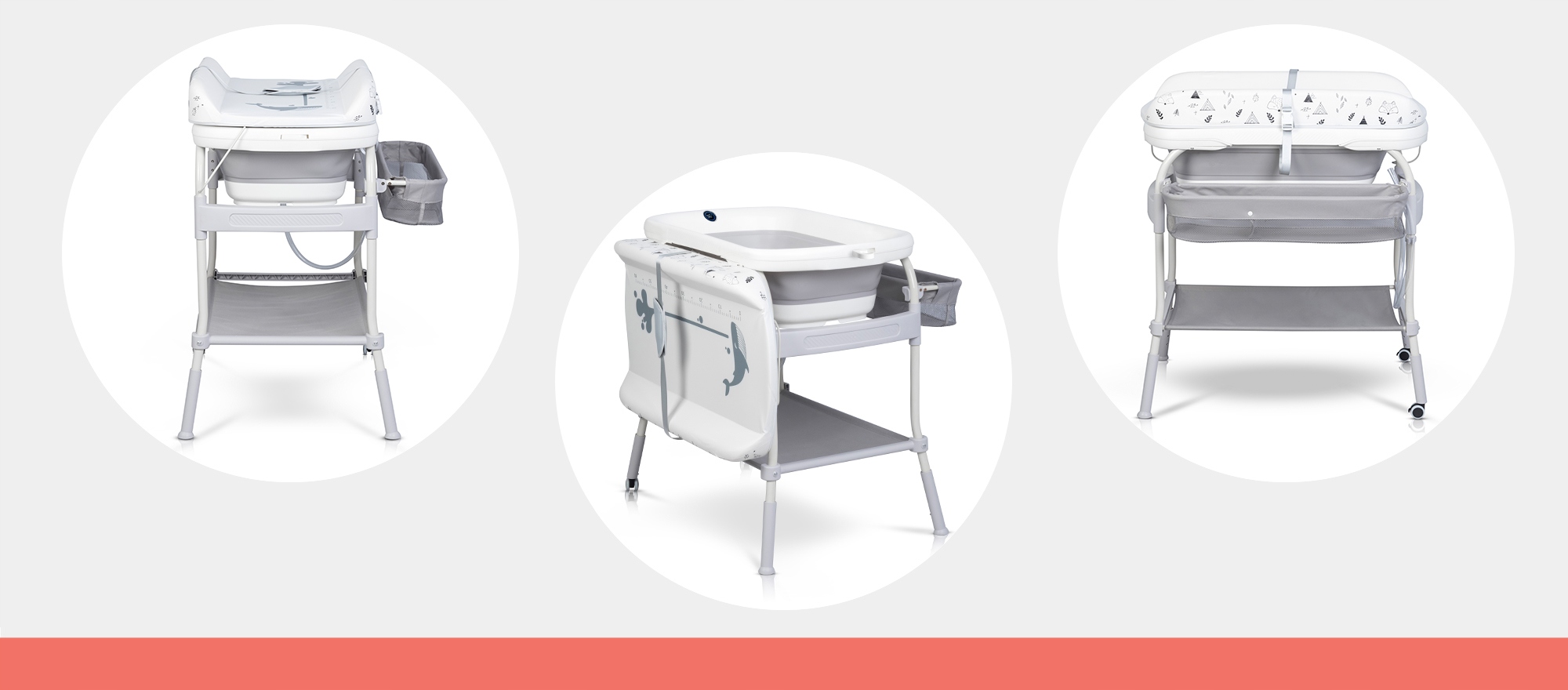 Колеса мають гальма, тому незалежно від того, чи використовуєте ви ванночку чи пеленальний столик ви можете бути впевнені, що продукт стабільний і безпечний. У нижній частині розташована велика полиця для таких речей, як рушник, а збоку розташований зручний органайзер, в який можна помістити все приладдя для купання або те, що необхідно для зміни підгузків дитини.