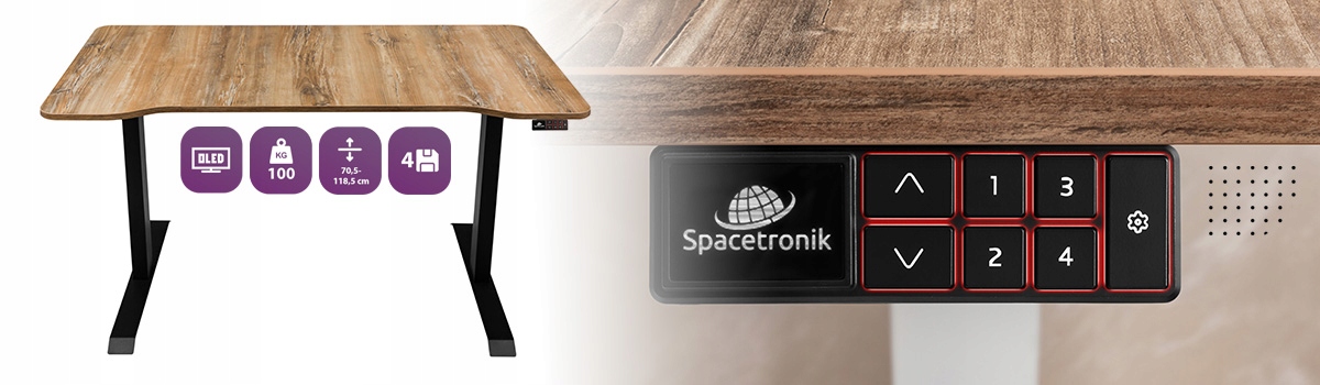 Електрорегульована рама Spacetronik SPE-221OW оснащена контролером зі зручностями. Внесіть зміни, збережіть налаштування на чіткому OLED-дисплеї. Налаштуйте висоту за допомогою кнопок «вгору» та «вниз» і спостерігайте за поточним положенням на OLED-екрані. Збережіть до чотирьох вибраних параметрів висоти та використовуйте їх у майбутньому. Стіл дозволяє заблокувати контролер, наприклад, від небажаного використання дітьми. Простір навколо кнопок підсвічується кількома кольорами по черзі.