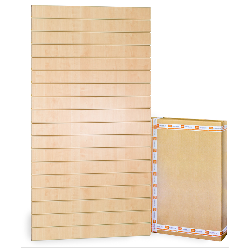 Панель Slatwall шириною 100 см і висотою 180 см, кольору клена з символом D375SM з книги шаблонів Kronopol. Панель виготовлена з плити МДФ товщиною 18 мм, двосторонньо ламінованої, з гладкою структурою поверхні, з пластиковими вставками бежевого кольору, розташованими один від одного (по осях) через кожні 10 см. У панелі висотою 180 см 17 фрез. Spacewall має напівфрези вгорі та внизу, які дозволяють з’єднувати модулі разом за допомогою шпильок, тож з’єднання спереду непомітне.