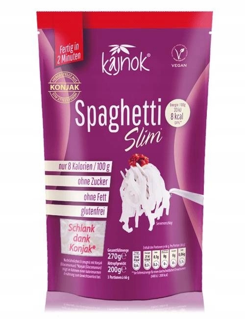 Kajnok fettuccine Slim не містить глютену, веганського продукту, містить багато клітковини та цукру. Вони не містять жирів і вуглеводів і мають неймовірні 8 ккал на 100 г. Вони надовго забезпечують ситість і підходять усім, хто хоче схуднути, оскільки вони допомагають схуднути в рамках низькокалорійної дієти. Спагетті Кайнок ідеально поєднуються з різними соусами, овочами, грибами та рагу. Завдяки своїй широкій структурі вони надають соусу відносно велику поверхню, до якої можна приклеїтися, що робить кожну виделку повним смаком.