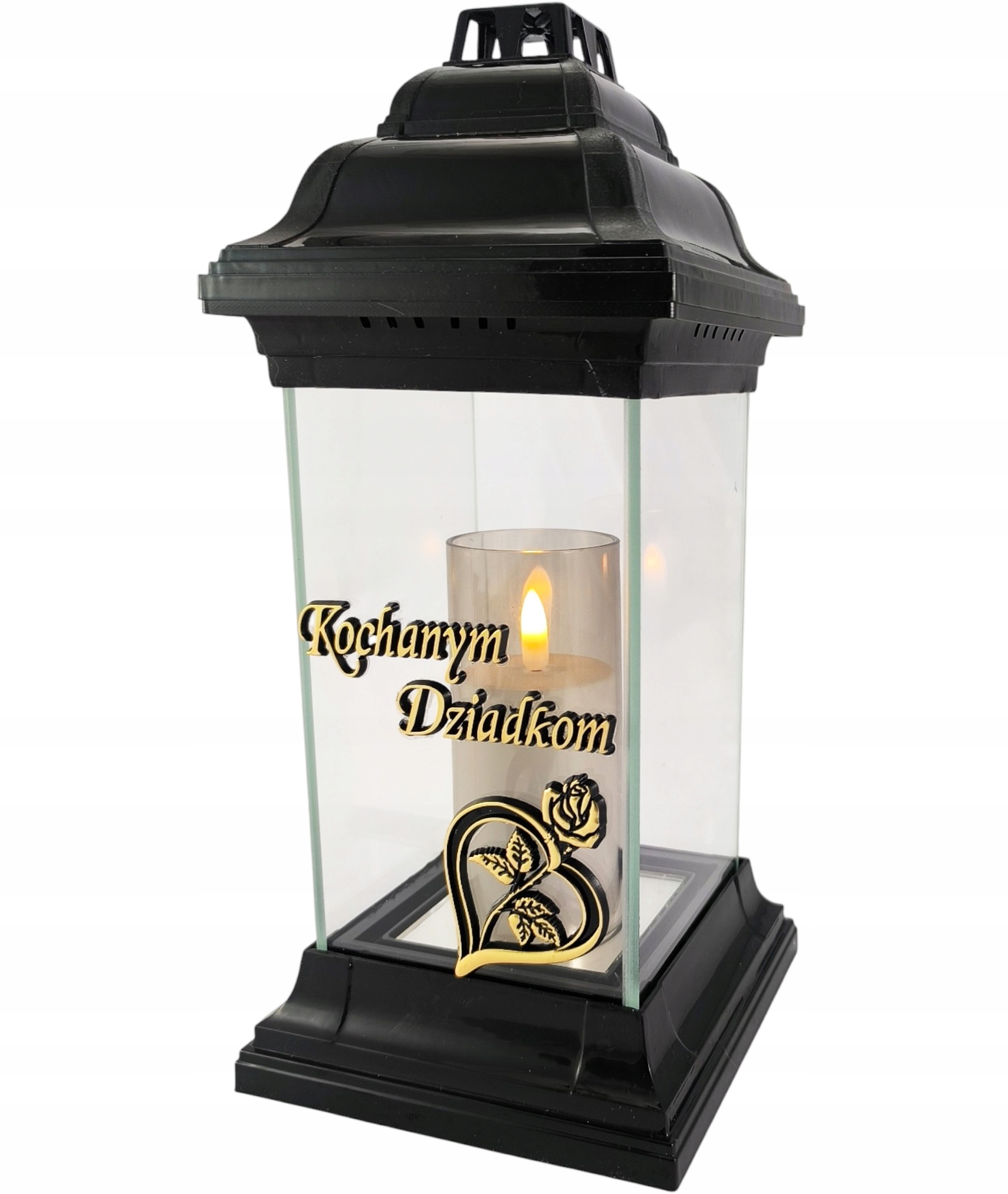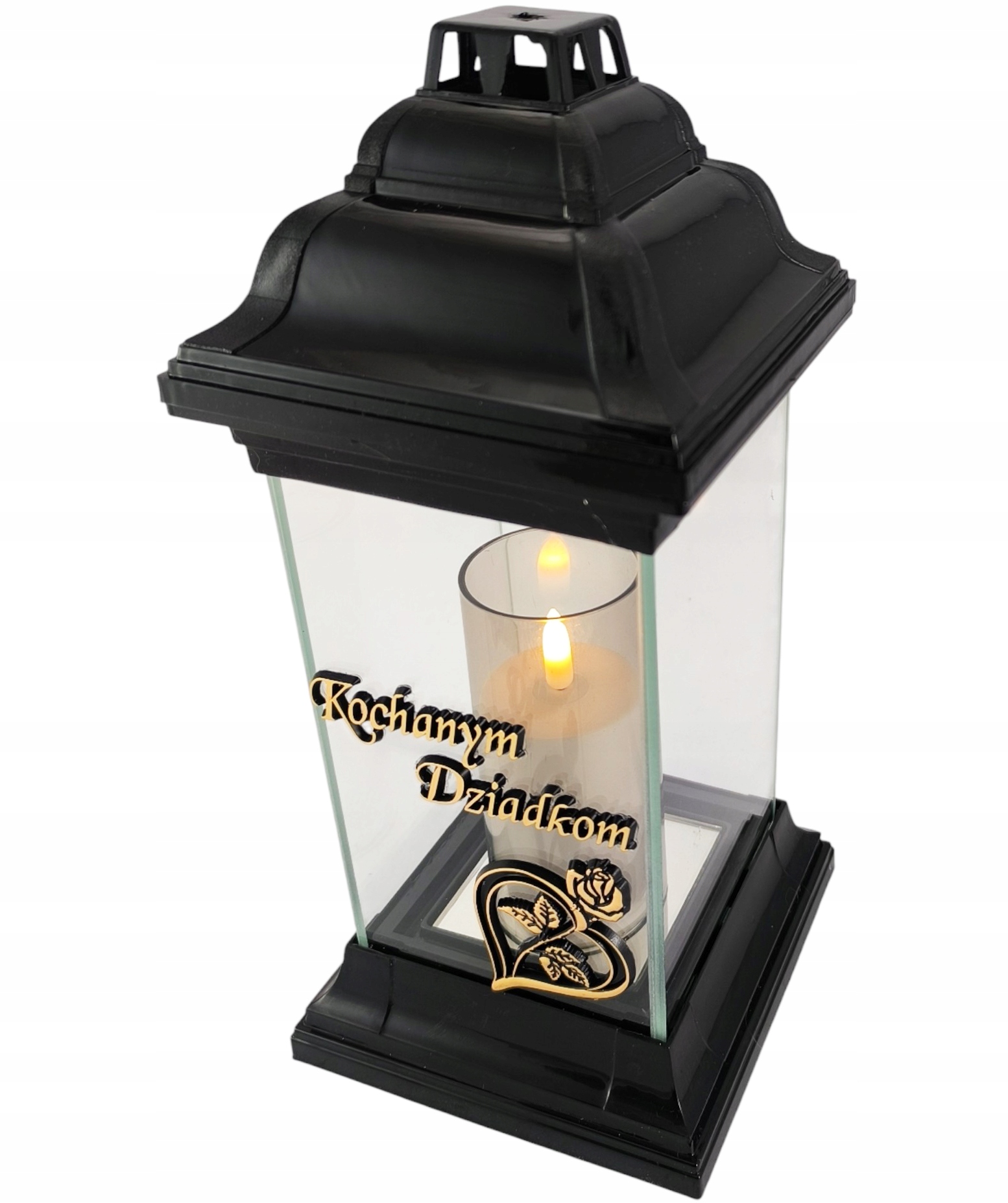 Святочка виготовлена з товстого безбарвного скла. Посередині склянки золотистий напис Дорогим бабусям і дідусям Під написом зображено мотив серця з трояндою, що символізує любов і пам'ять. Ліхтарик важкий, міцний, а широка основа забезпечує стійкість. Ліхтар має широкий отвір для вставки діаметром 7,5 см, тому він адаптований до багатьох розмірів парафінових і масляних вставок і різних типів фігурок і світлодіодних вставок.