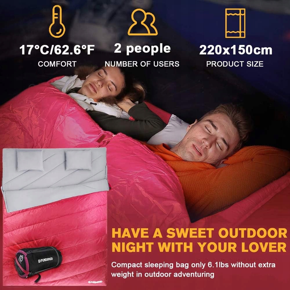 - Ви хочете комфортно спати будь-де? Цей зручний і легкий подвійний спальний мішок ідеальний. Завдяки значним розмірам (87 х 59) дюймів в ньому просторо і комфортно розмістяться 2-3 людини. Компресійний кемпінговий спальний мішок стискається лише до (7 x 12,6) дюймів для зручного пакування, перенесення та зберігання.
