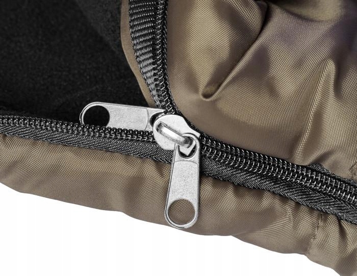 Поверхня спального мішка виготовлена з міцного та зручного нейлону кольору хакі та чорного кольору.