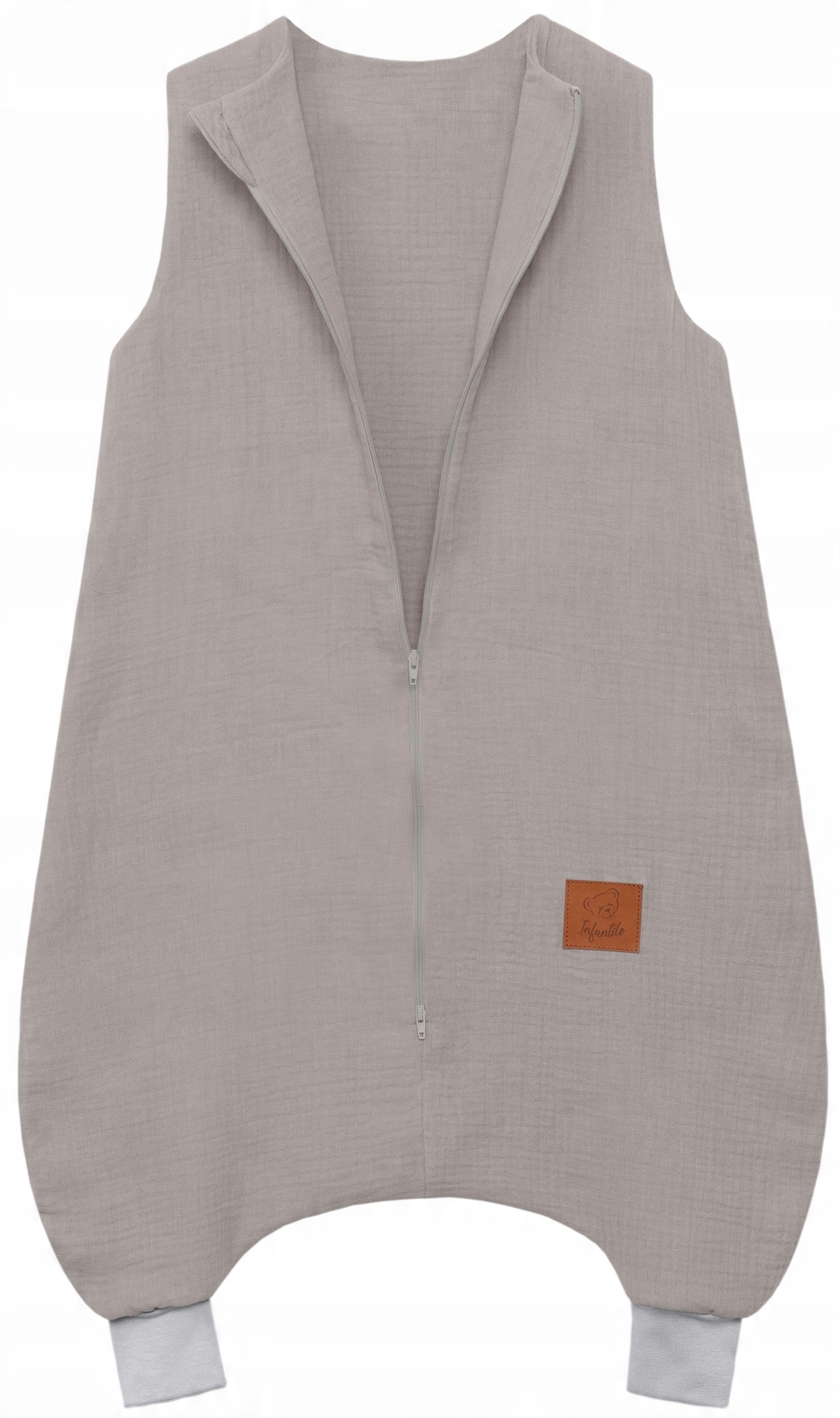 Подвійний муслін - це м'яка та ніжна тканина, яка ідеально підходить для чутливої дитячої шкіри. Спальний мішок оброблений м'якими та еластичними світло-сірими манжетами, які ідеально облягають ніжки дитини.