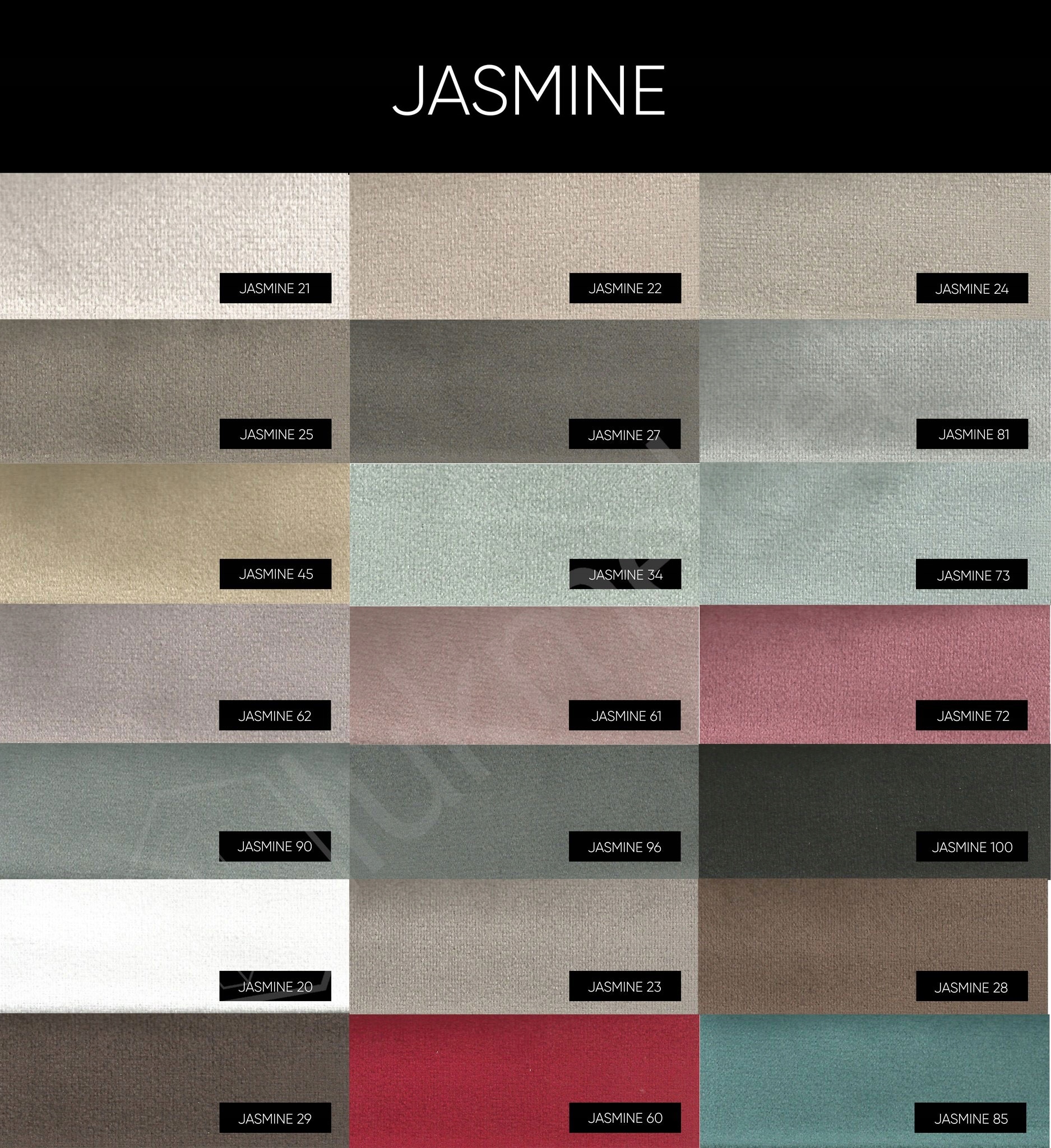 Жасмин - плюшева тканина. Він приємний, м'який на дотик і довговічний. Характеризується високою стійкістю до світла - не тьмяніє і не лущиться під час використання. Ідеально виглядає в якості оббивки ліжка, кутового дивана або крісла. Тканина характеризується відтінком матеріалу.