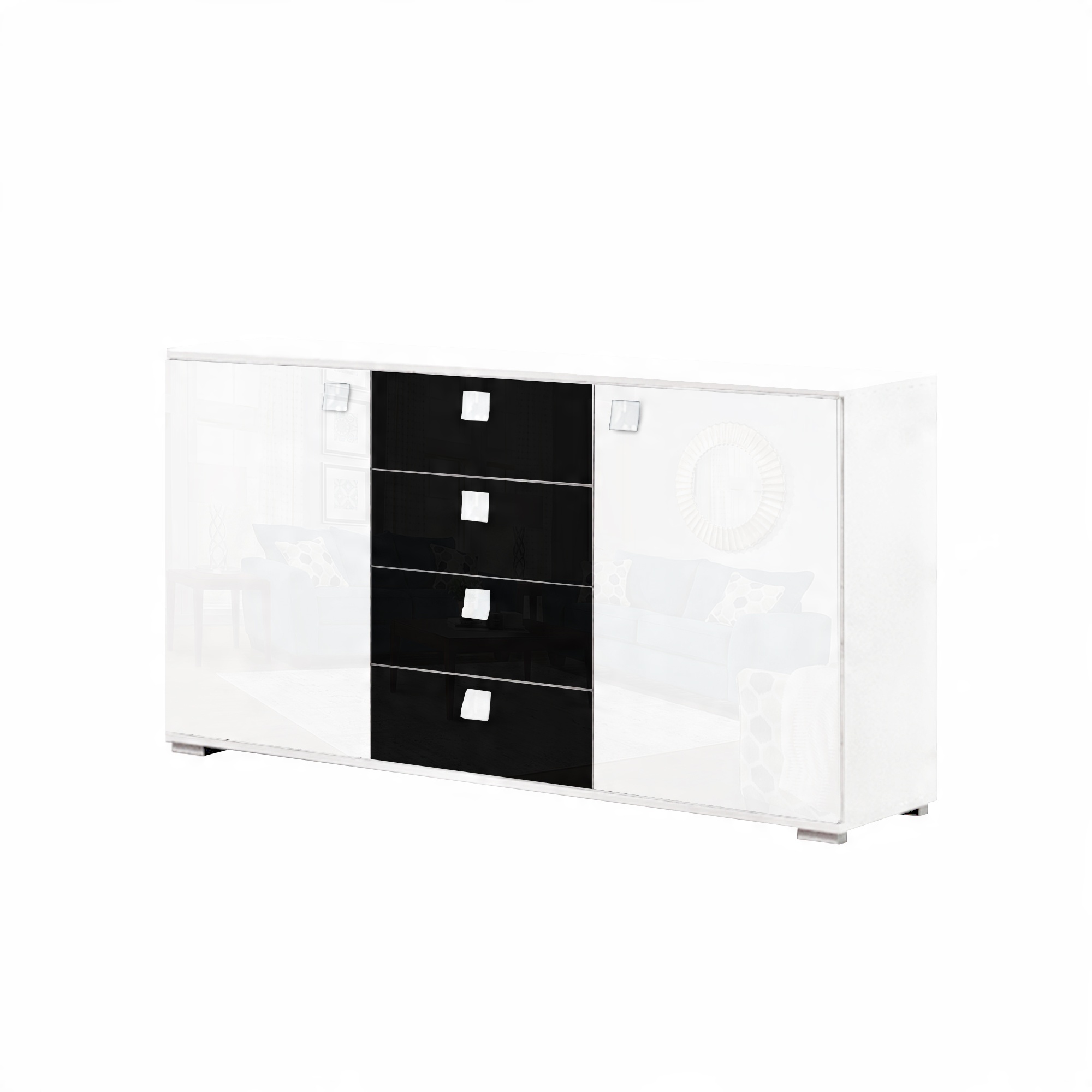 - Він має чотири місткі висувні ящики та дві великі шафи з відкидною передньою частиною