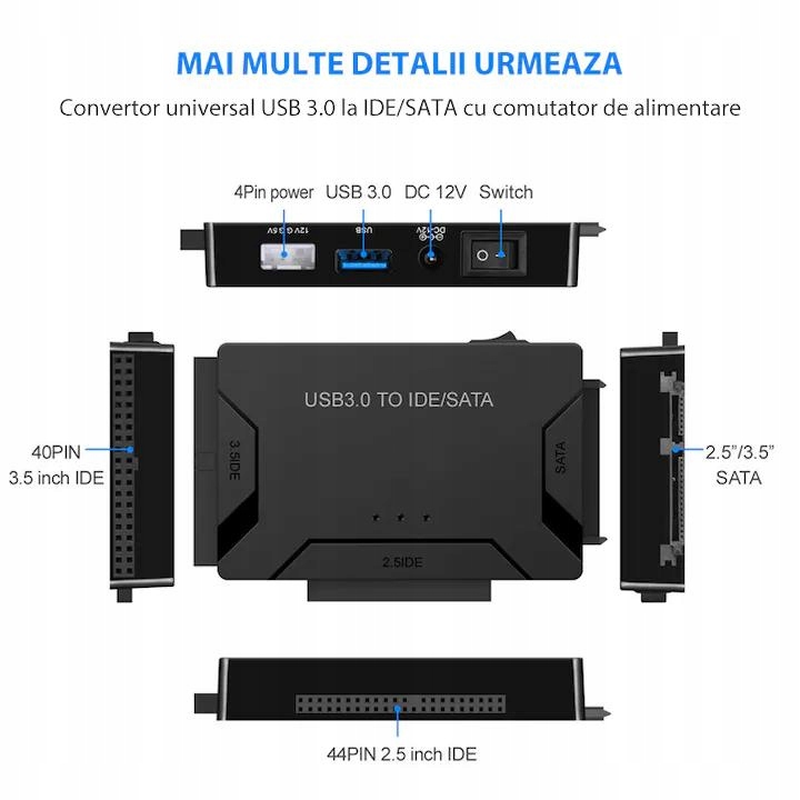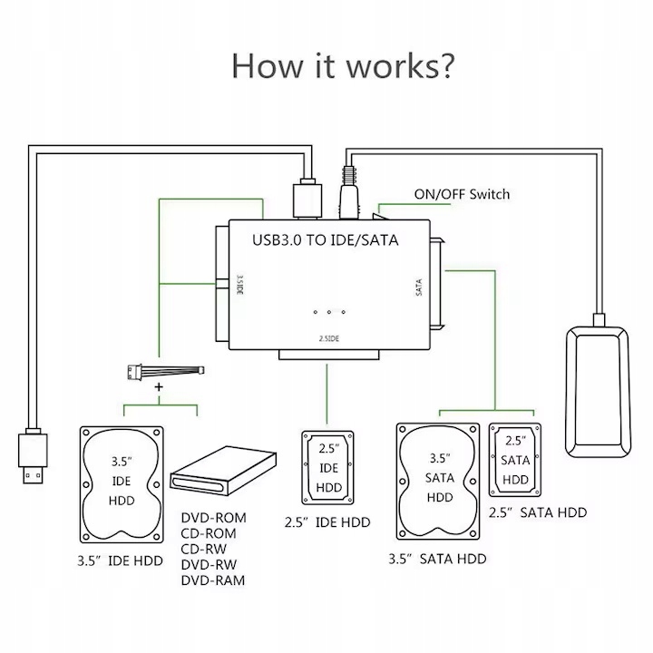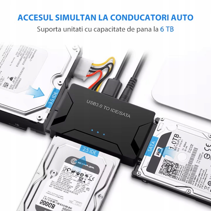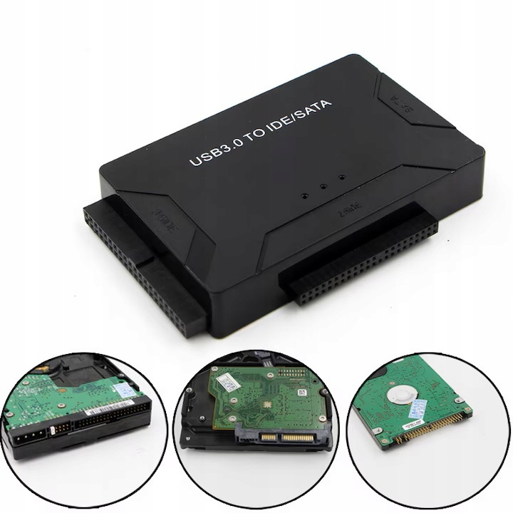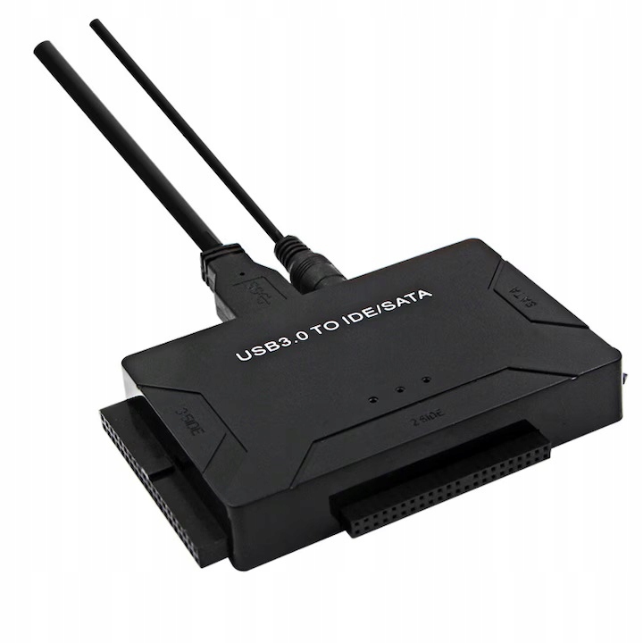 Конвертер USB 3.0 до SATA/IDE (міст) підключає жорсткі диски IDE/SATA 2,5"/3,5" до накопичувача через порт USB. Ви може швидко передавати великі обсяги даних з одного диска на інший. Він має роз'єми SATA II і два роз'єми IDE (40-контактний і 44-контактний), усі три жорсткі диски можна підключати одночасно. b> Це ідеальний спосіб зменшити місткість вашого ноутбука чи настільного комп’ютера.