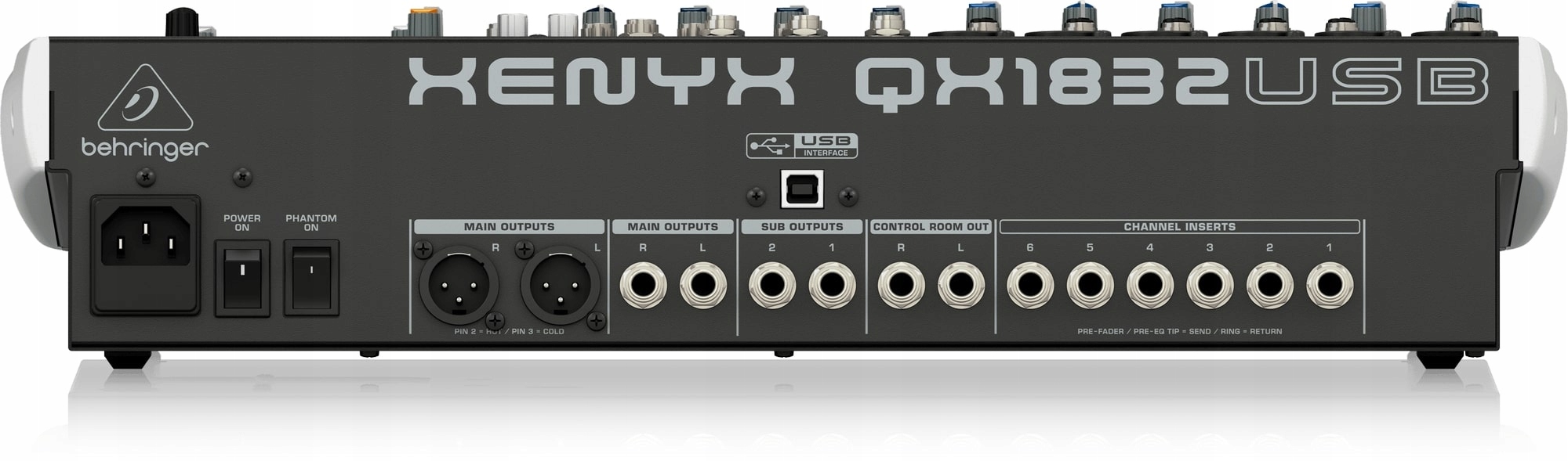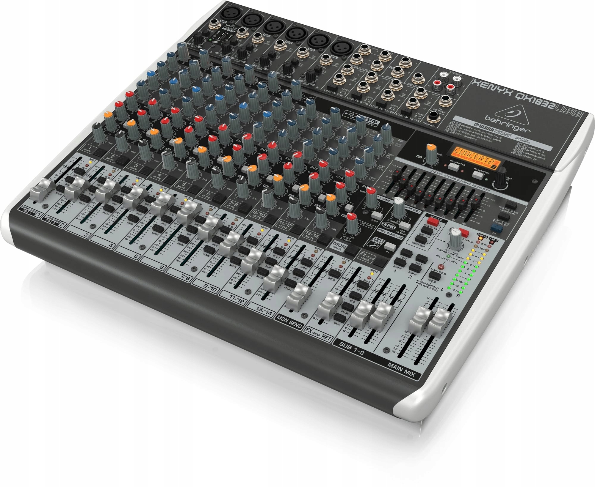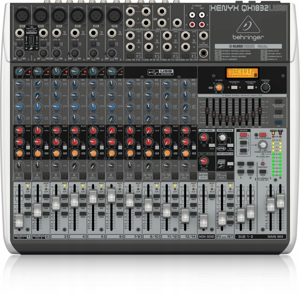 BEHRINGER XENYX QX1832USB - аналоговий мікшер із наднизьким рівнем шуму XENYX QX1832USB із процесором KLARK TEKNIK FX, із 6 мікрофонними попередніми підсилювачами XENYX та індивідуальним блоком живлення PHANTOM.