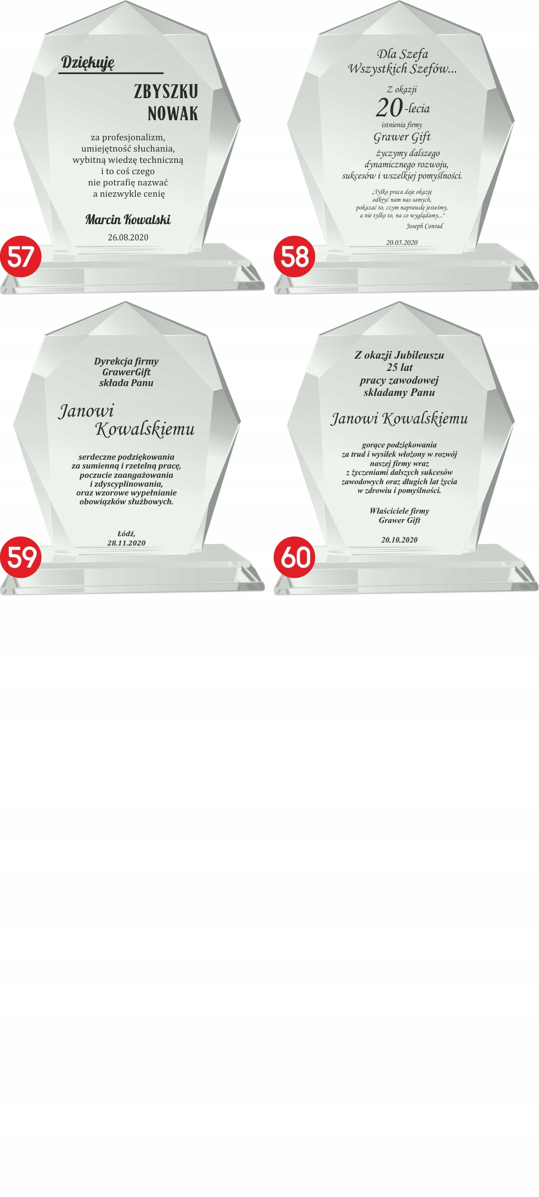 Красива скляна подяка виготовлена за допомогою технології лазерного гравіювання безпосередньо на предметі. Скляна статуетка чудово виглядає завдяки своїй унікальній формі. Завдяки розрізам досягається незабутній естетичний досвід. Статуетка встановлена на міцній основі з такого ж матеріалу, які нероз'ємно з'єднані між собою. Гравірування виконується на високоякісному лазерному плоттері. Це означає, що гравіювання не відрізняється навіть на кількох придбаних виробах. Крім того, він наповнений вручну та дуже ретельно заповнений майстром спеціальною фарбою. Золота або срібна фарба дає дивовижний ефект. Ви більше ніде не знайдете такої високої якості. Людина, яка отримає подарунок такої високої якості, неодмінно буде в захваті, а ви будете пишатися тим, що змогли йому це подарувати.