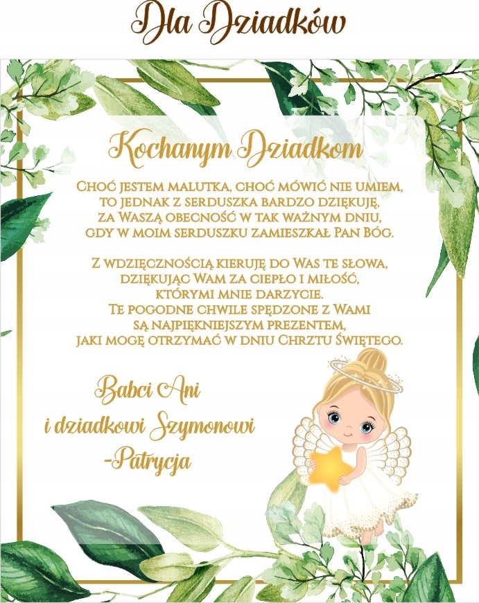 - Будь ласка, змініть імена хрещених батьків, бабусі, дідуся (наприклад, тітка Патриція, дядько Данило, бабуся Аніела та дідусь Шимон тощо)