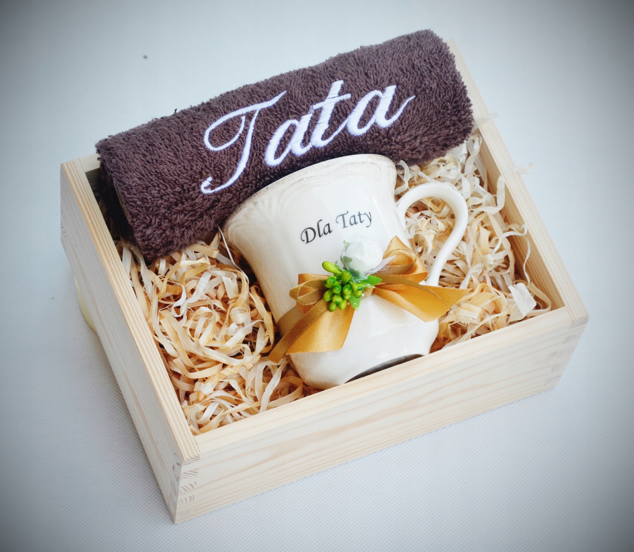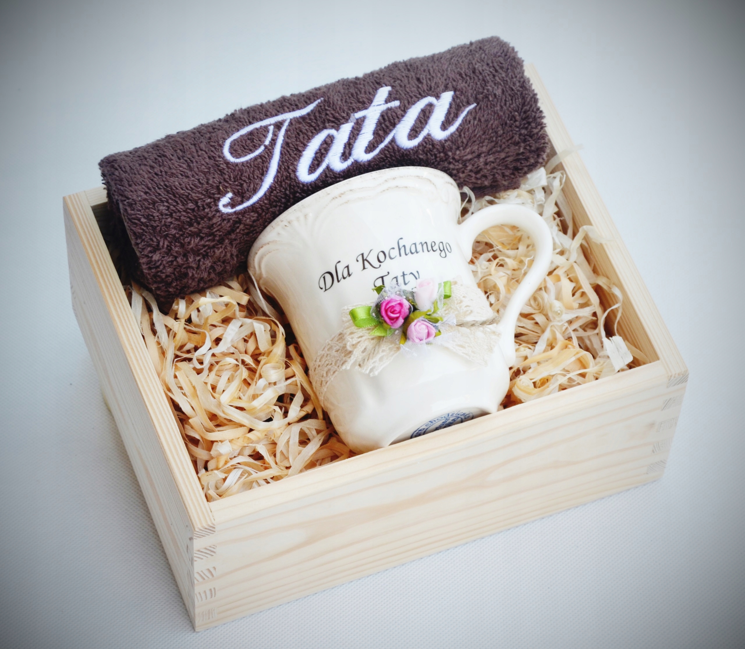 - рушник банний товстий 50х30см, колір екрю, з коричневою вишивкою «Мама» (у комплект входить рушник білий у клітинку з написом сірого кольору) або рушник банний товстий 50х30см, коричневий з вишивкою білого кольору. "Tata" (набір включає сірий рушник у клітинку з чорним написом),