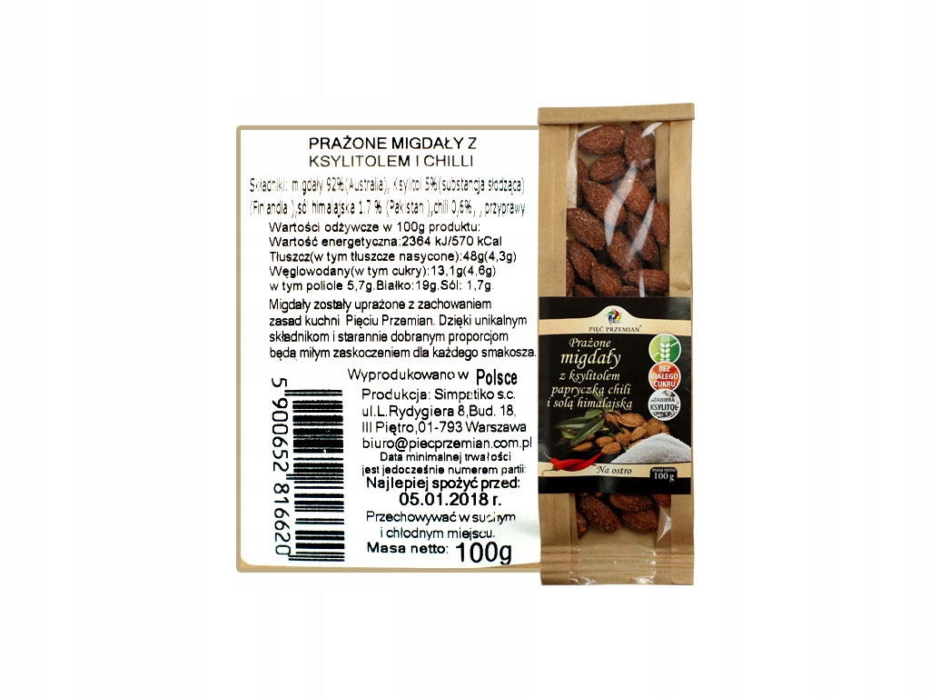 Склад: мигдаль 92% (Австралія), ксиліотль (підсолоджувач) 5% (Фінляндія), кориця (Цейлон) 2%, гімалайська сіль (Пакистан) 1,7%, чилі (0,6%), спеції.