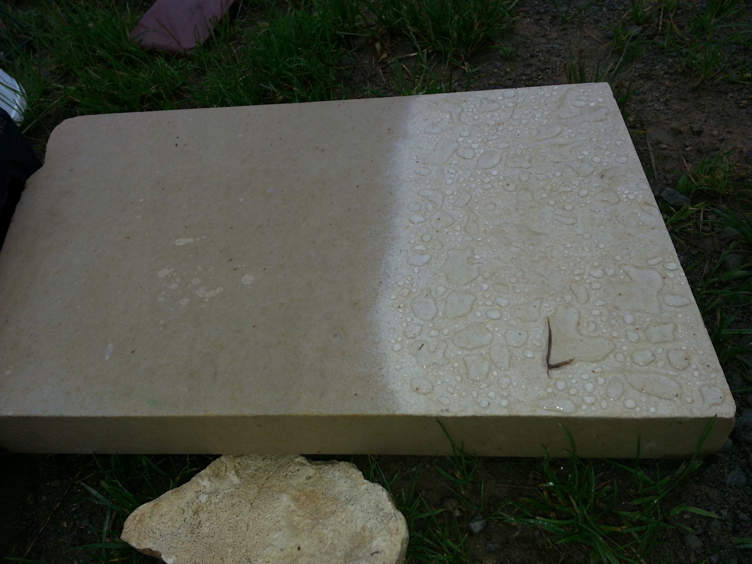 - Захист від вологи: пісковик пористий і легко вбирає вологу. Просочення пісковика створює захисний бар'єр, який перешкоджає проникненню води, солі, бруду або інших рідин в структуру каменю. Як наслідок, просочений пісковик більш стійкий до ерозії, що дозволяє йому краще зберігати свою міцність і естетичний вигляд протягом тривалого періоду часу.