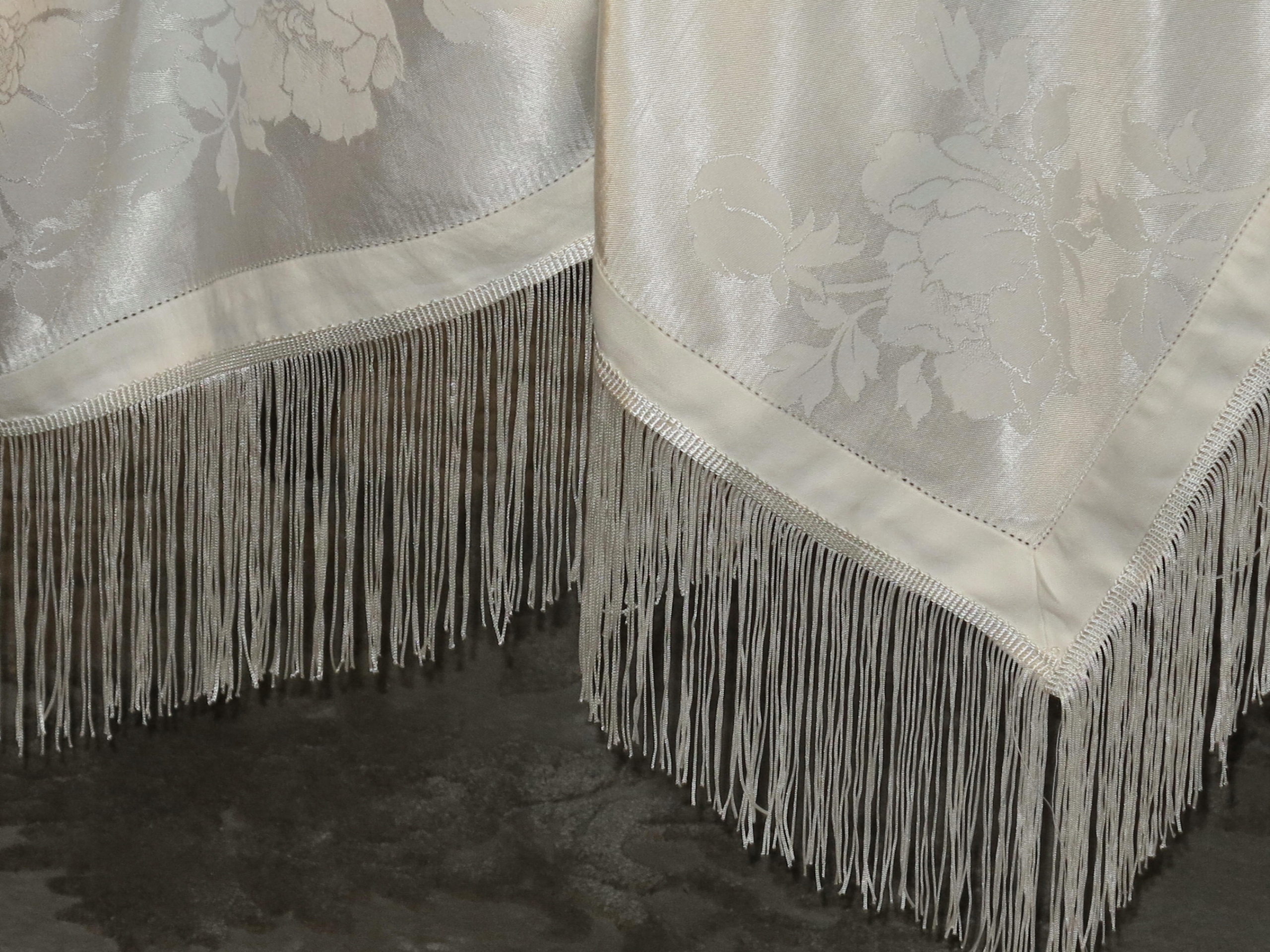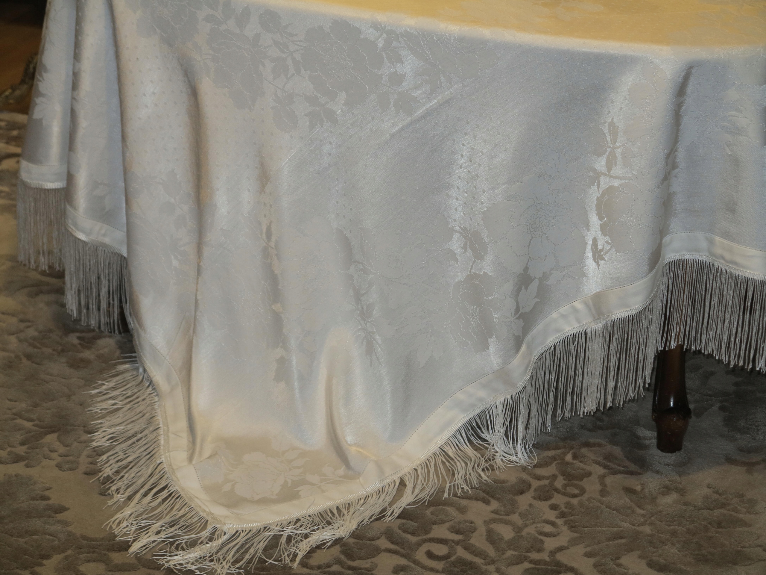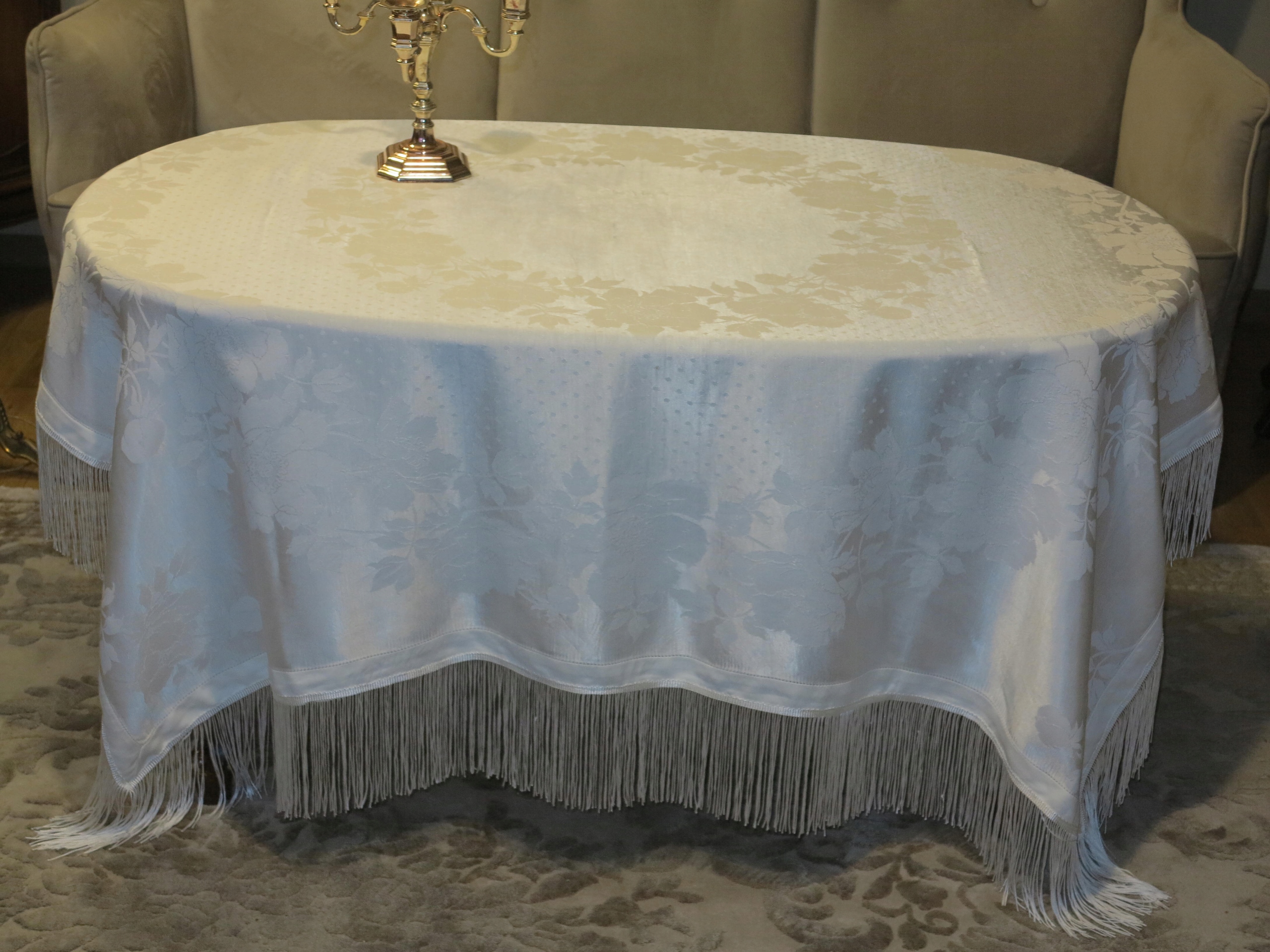 надзвичайно красива білузинова скатертина з бавовняною дамасом Дамаск. Фон у атласному блиску, матові квіткові візерунки. Скатертина навколо прикрашеної дуже довгими шовковими бахроми 14 см. Крім того, з бахромом, смужкою, прикрашеною мірською