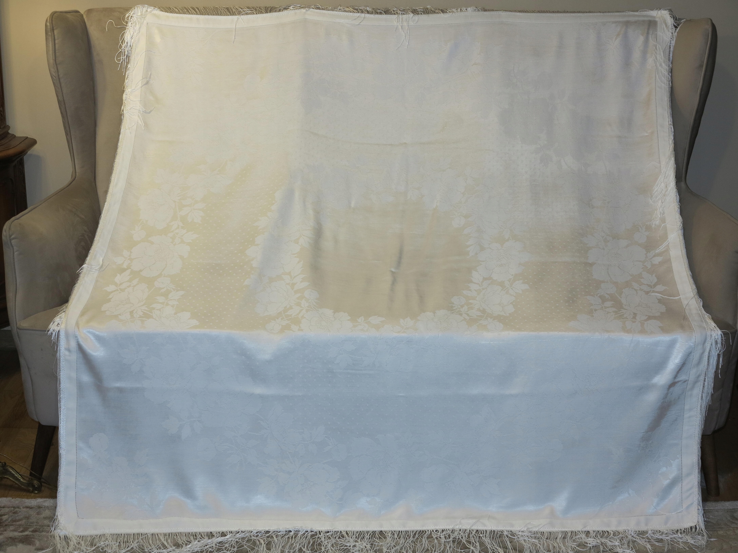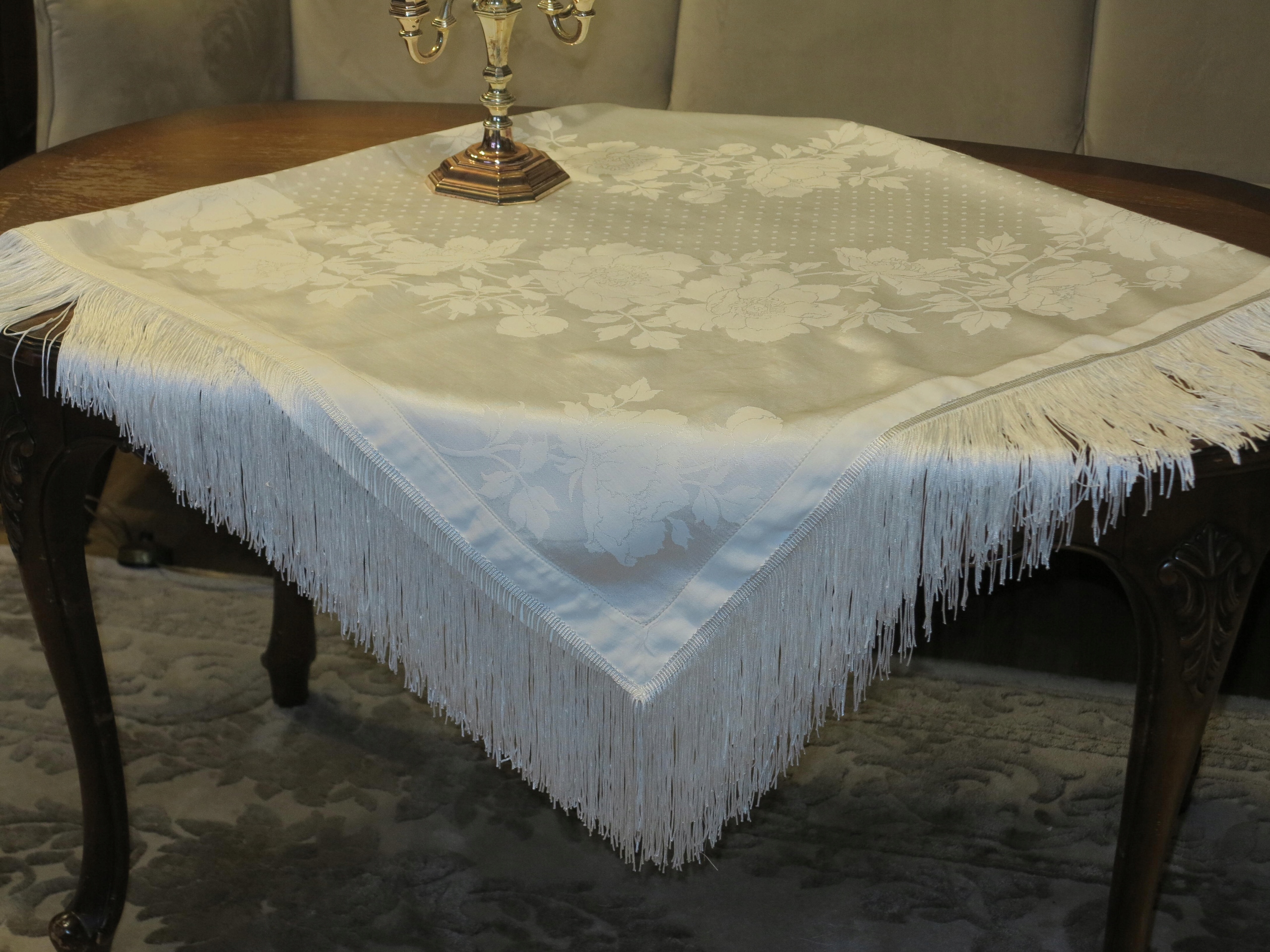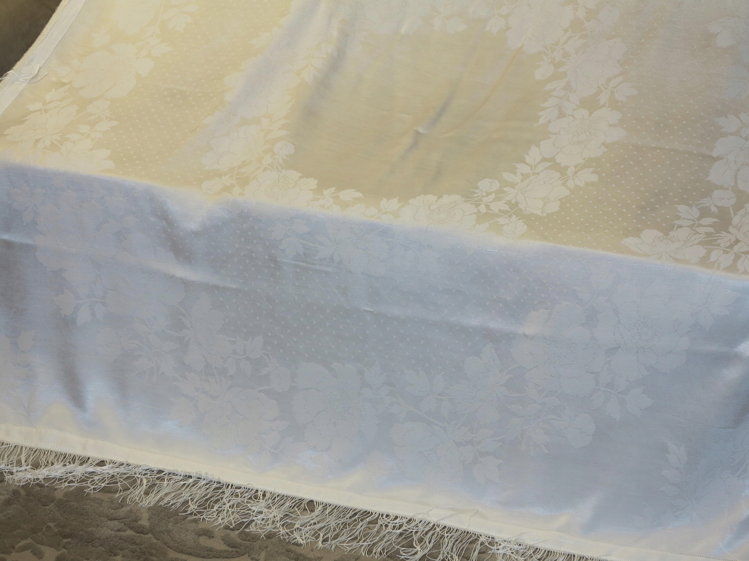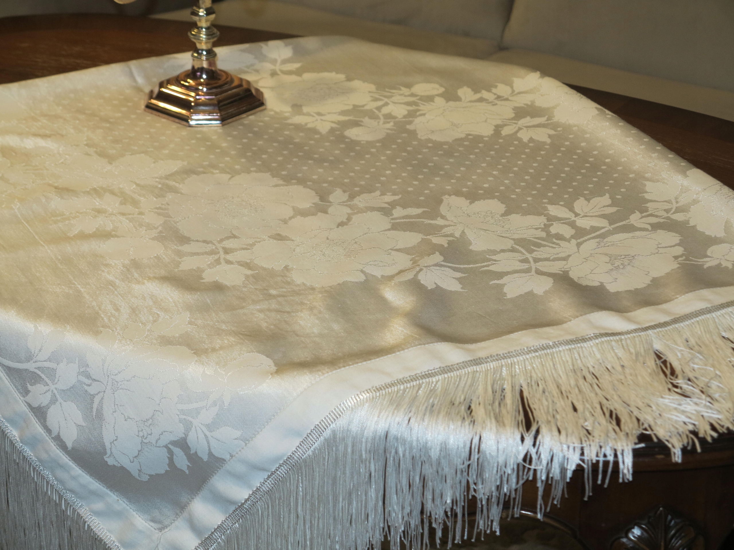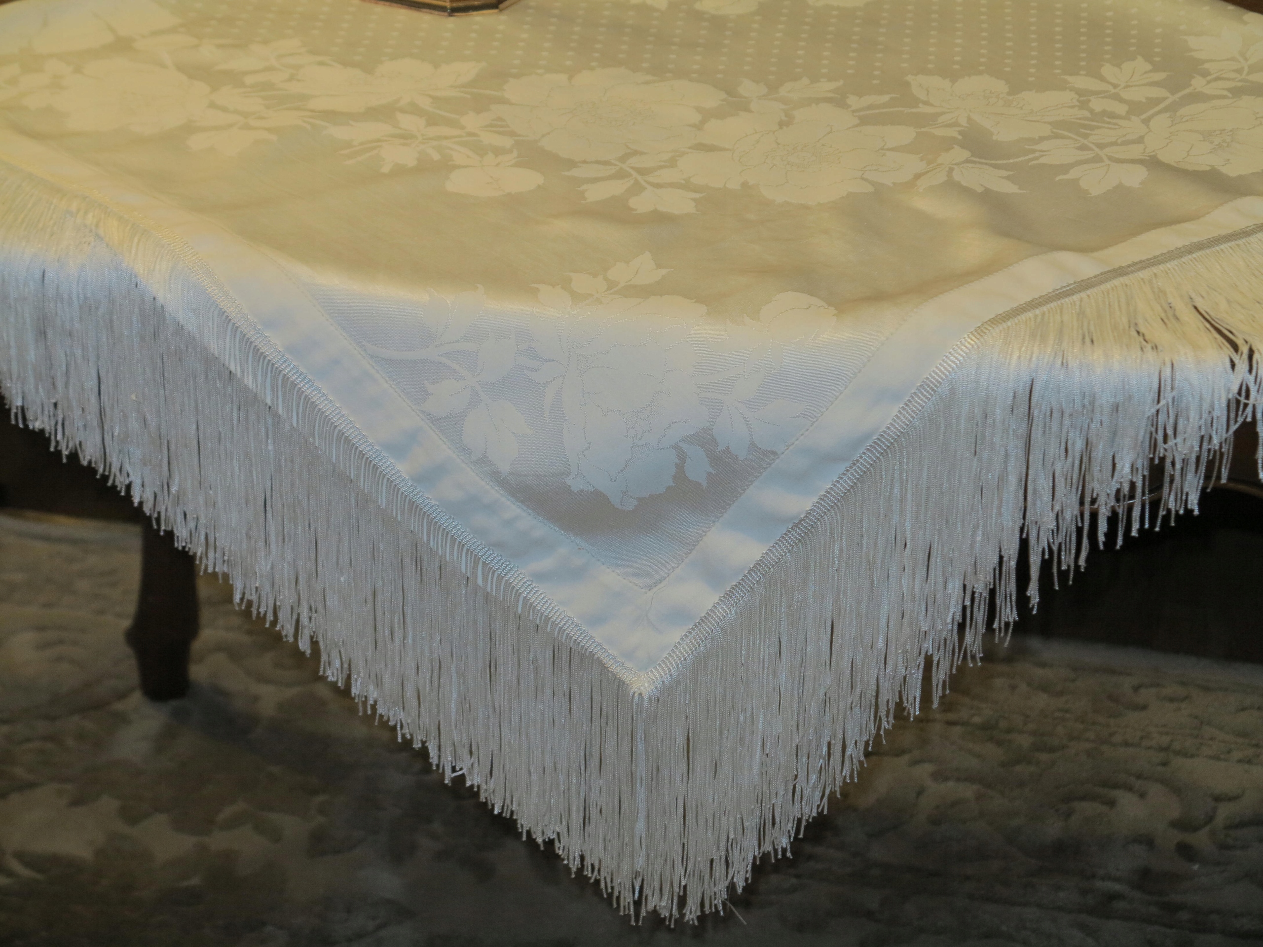 Поведінка. Скатертина ще красивіша в реальності. Дуже рідкоТема аукціону - це надзвичайно красива, дамаська скатертина з квітковими візерунками та дуже тривалими виливними бахроми. Скатертина має розміри: довжина 151 см, ширина 147 см+14 см. Використовувана скатертина, у супер хорошому стані. Рекомендую, це буде прекрасна прикраса столу. Я рекомендую.