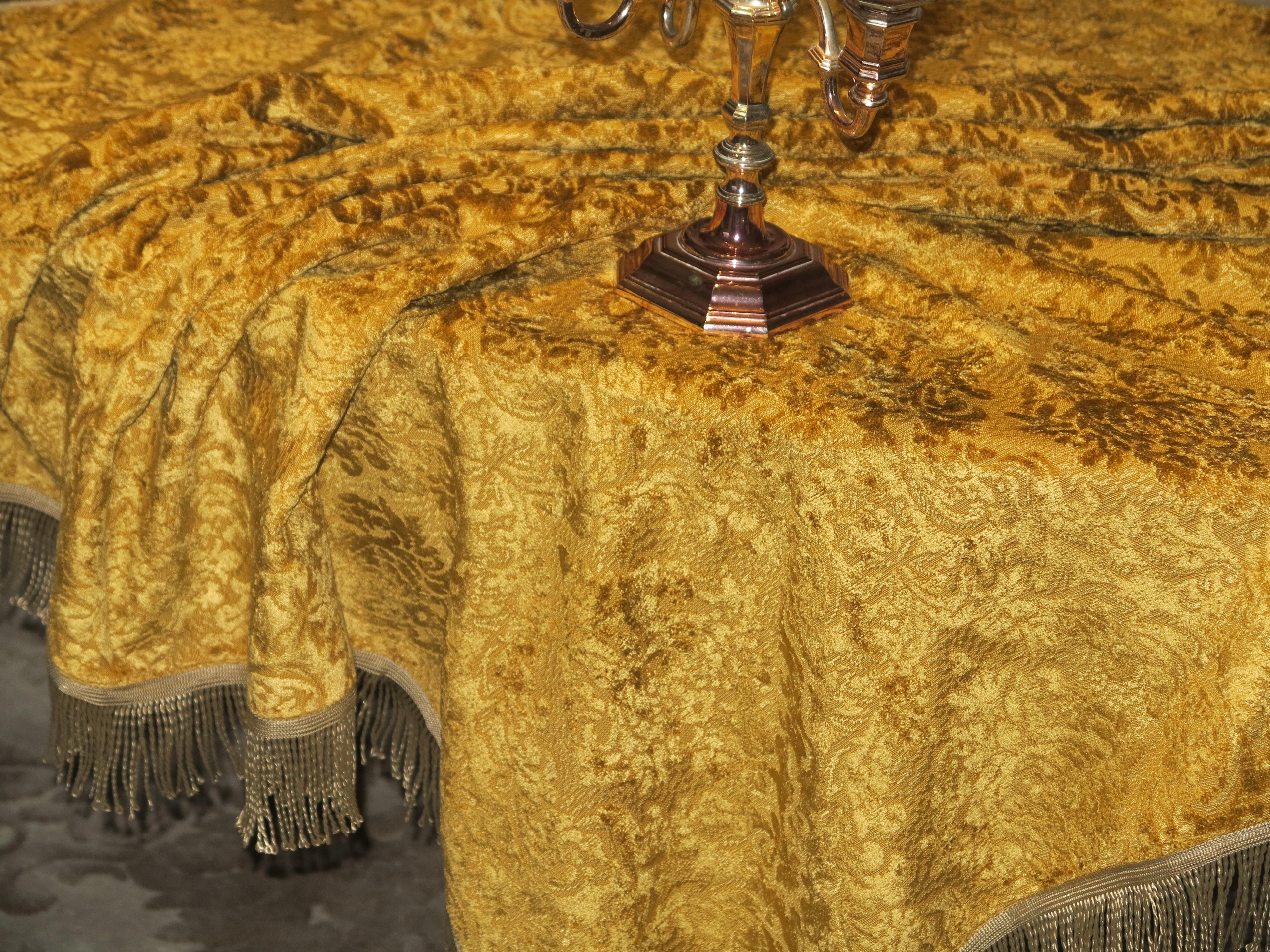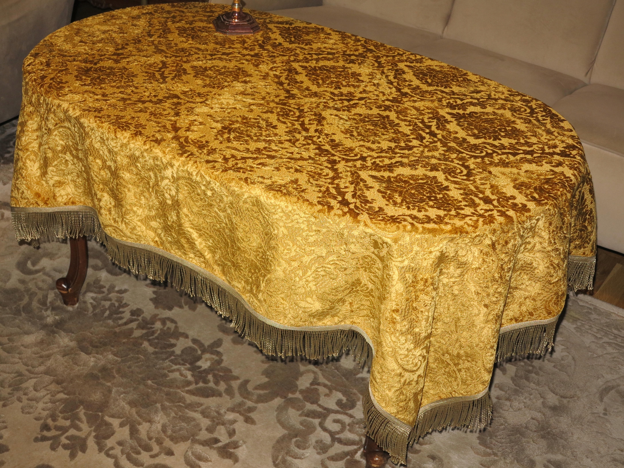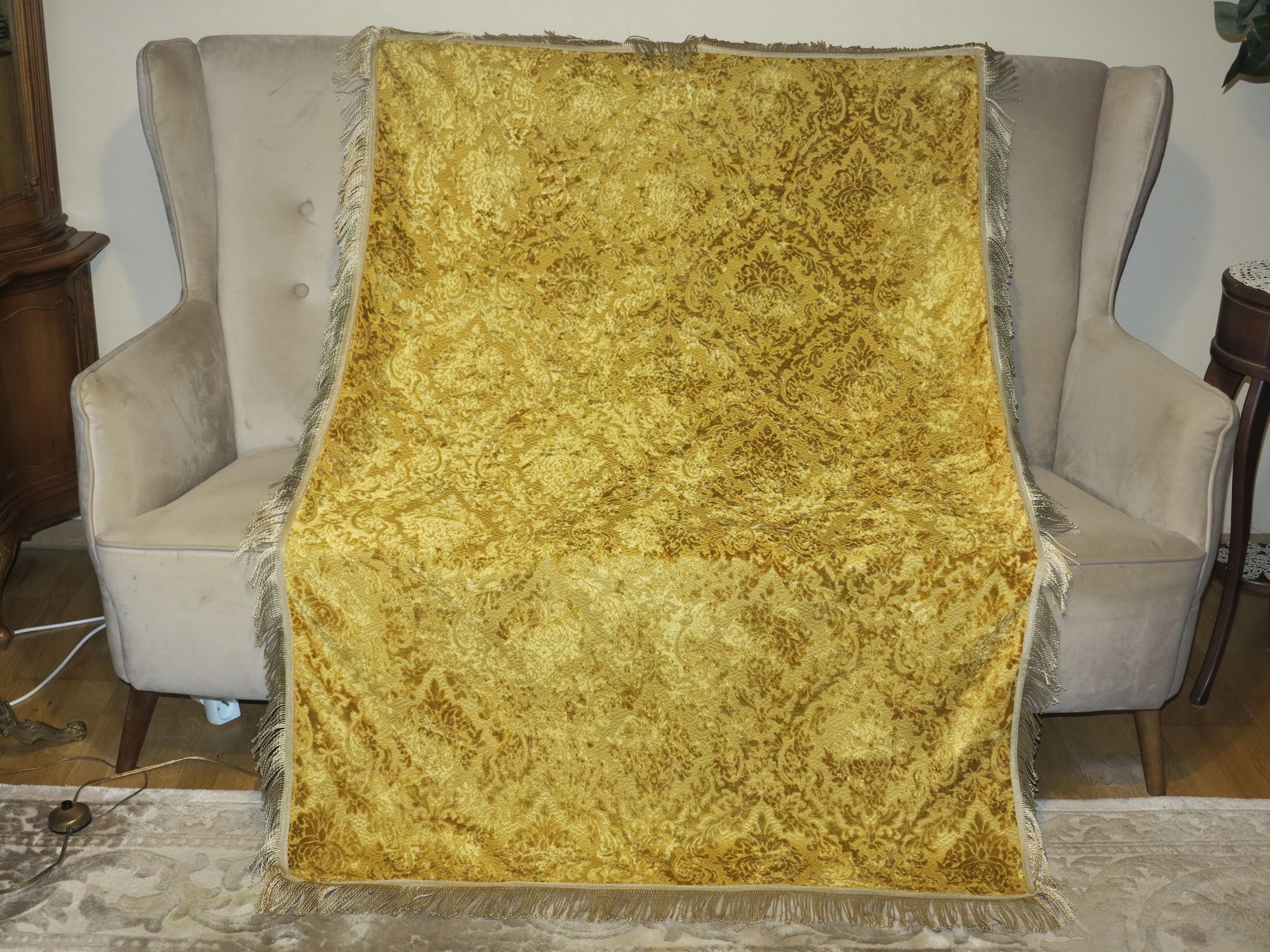ПІД АНТИКВАРІАТ - ГАРНУ СУЦІЛЬНУ І ЩІЛЬНУ СКАТЕРТИНУ ГОБЕЛЕН З ВИПУКЛИМ ОКСАМИТНИМ АКАНТОВИМ УЗІРЕЛКОМ. СКАТЕРТИНА КОЛЬОРУ СТАРОВОГО ЗОЛОТА, ІЗ ЗОЛОТОЮ БАХОМКОЮ НАВКОЛ.