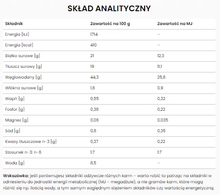 - Одним з основних джерел білка є риба. Рибне борошно, що міститься в композиції, — це не що інше, як запечена риба, сформована в порошок перед додаванням до рецепту їжі, тобто просто риба без води (також сушений, сублімований, зневоднений або порошкоподібний продукт). З цієї причини продукти, що містять свіже м’ясо (що містить приблизно 70% води), можуть містити набагато менше, ніж продукти, що містять борошно – чисте джерело білка. Корми SPECIFIC™містять білу атлантичну рибу, головним чином путасу.