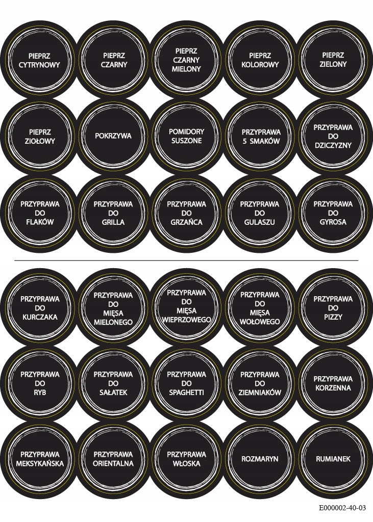 Набір з 120 міток FI40 є ідеальним рішенням для визначення спецій у банках. Чорний колір з елегантною обробкою чудово виглядає як на кришках, так і на стінах контейнерів. Наклейки водонепроникні та стійкі до стирання , що гарантує їх довговічність під час повсякденного використання.