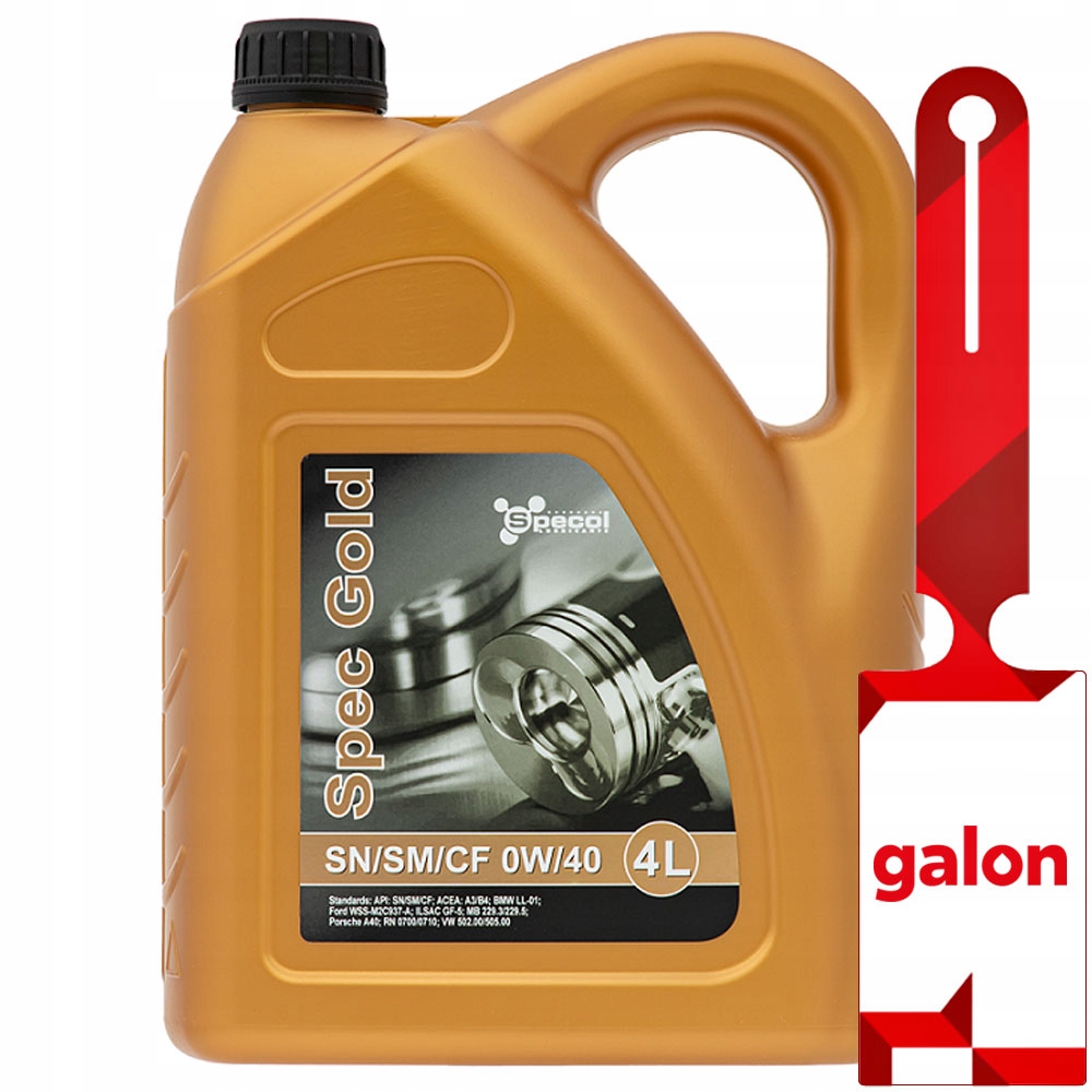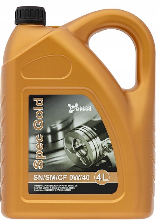 Spec Gold SN/SM /CF 0W/40 - масло на основі ретельно відібраних синтетичних базових масел і пакету збагачувальних присадок. Технологія синтетичного масла забезпечує ідеальне змащення всіх компонентів двигуна навіть в екстремальних умовах експлуатації. Пакет присадок обмежує накопичення відкладень, забезпечуючи високу чистоту двигуна. Він дозволяє збільшити інтервали між замінами масла. Олива забезпечує чудову текучість за низьких температур, що гарантує негайне змащування після запуску та мінімізує знос двигуна.
