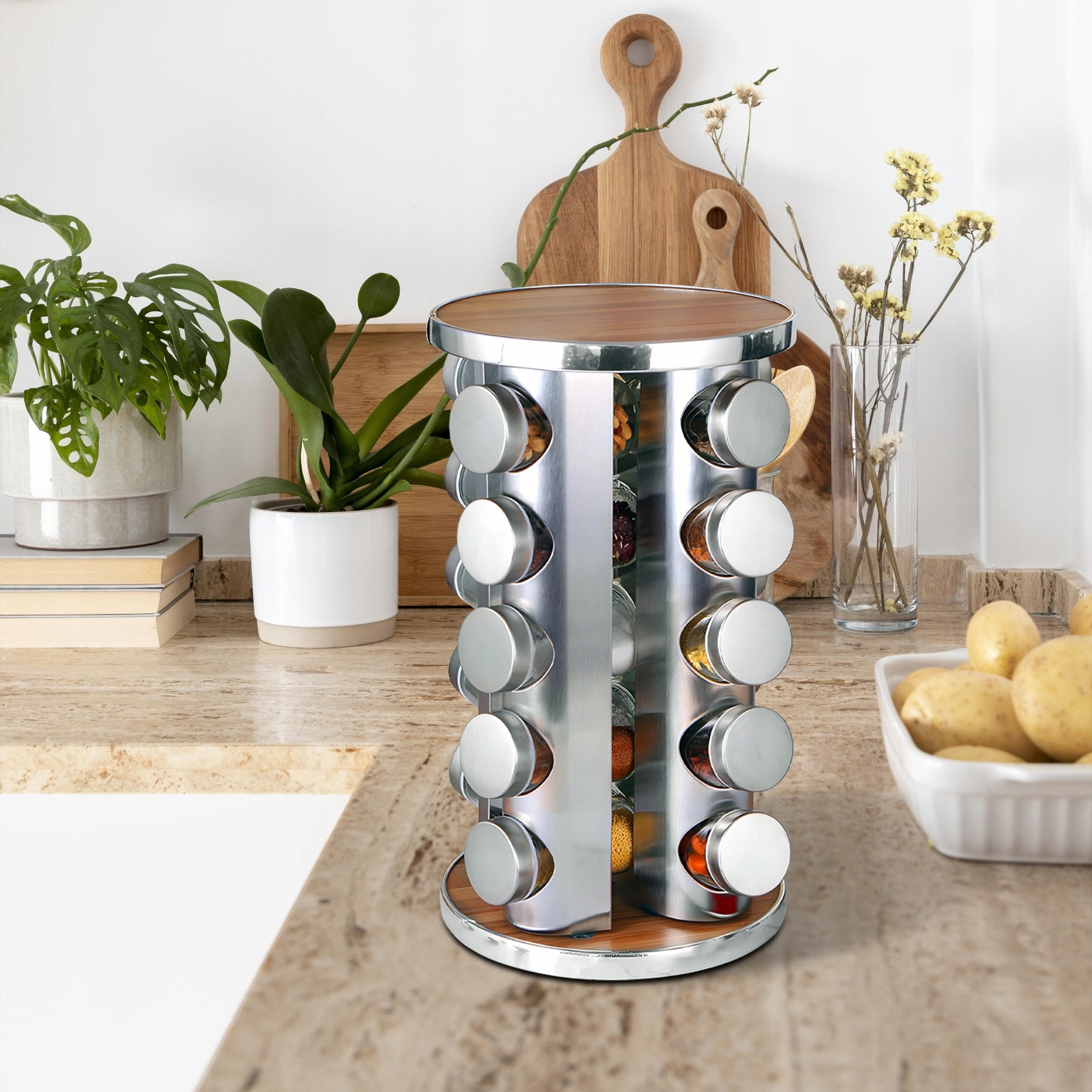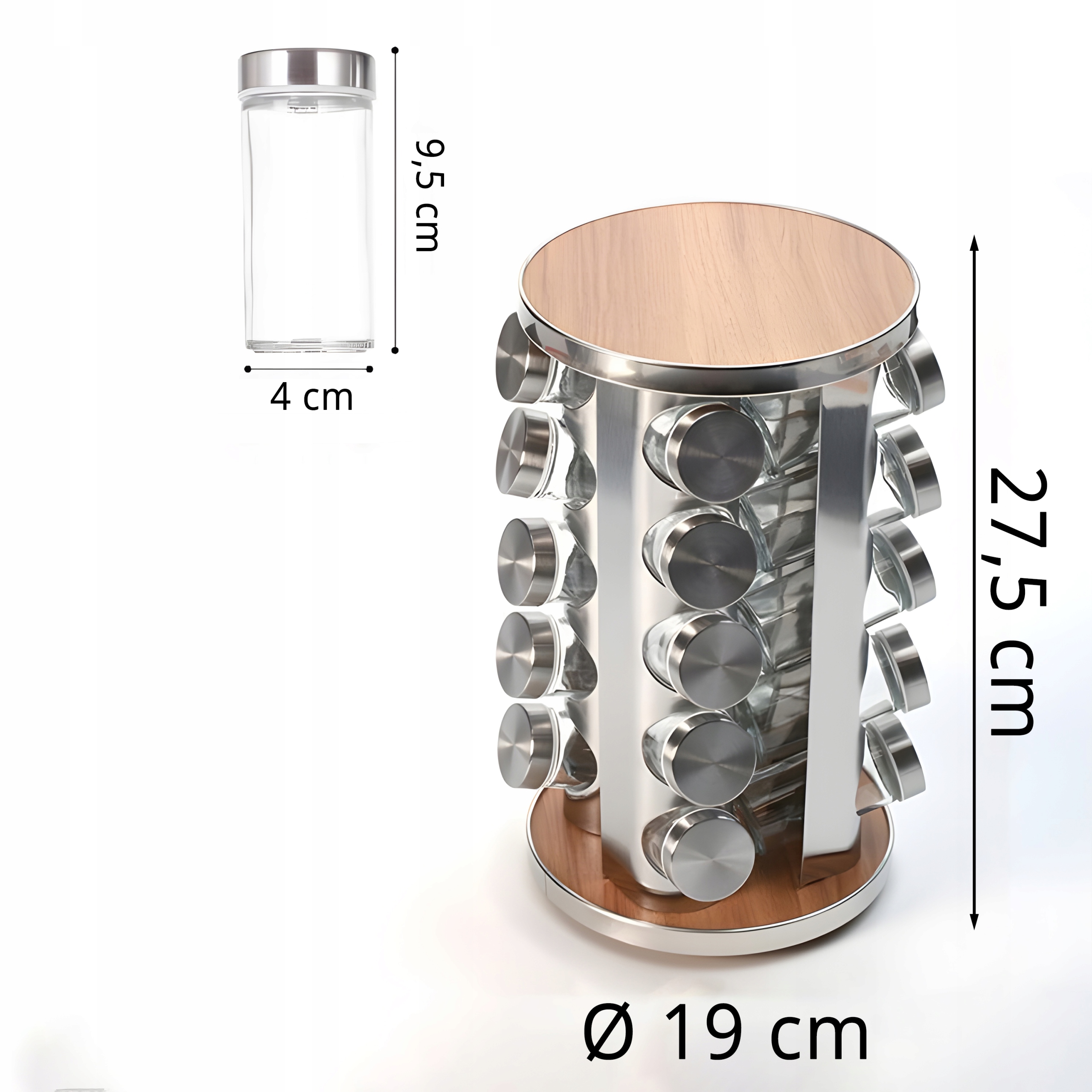 Використані для виготовлення набору скло та метал найвищої якості роблять його не лише практичним, але й елегантним. У набір входить 16 контейнерів для спецій, які довше збережуть вашу кухню в порядку, а спеції – свіжими. Поєднання нержавіючої сталі, скла та дерев’яних підставок створює мінімалістичний дизайн, який підходить до будь-якого інтер’єру.