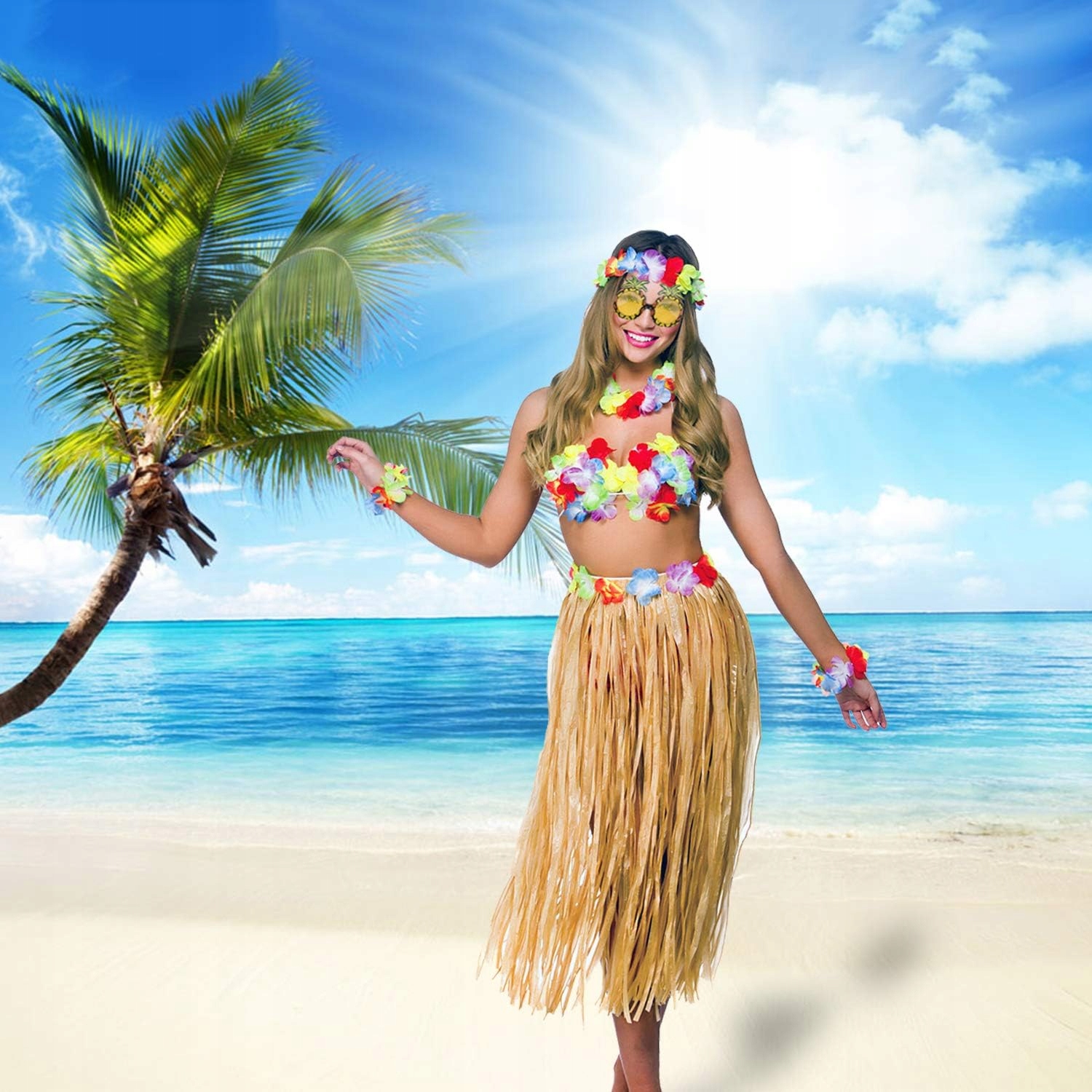 У цьому комплекті спідниці Hula є все, що вам потрібно, щоб створити свій стиль луау. Ви виглядатимете як на острові в оригінальній жовтій трав’яній спідниці з барвистими тканинами кольору гібіскуса, прикріпленими до еластичної талії; гачок надійно закріплює їх. Регульований верх бікіні з гібіскуса має підкладку для комфорту. Додайте завершальні штрихи – пара еластичних браслетів із квітами та гібіскусом, сонцезахисні окуляри з квітами гібіскуса та заколка для волосся з гібіскусом – настав час