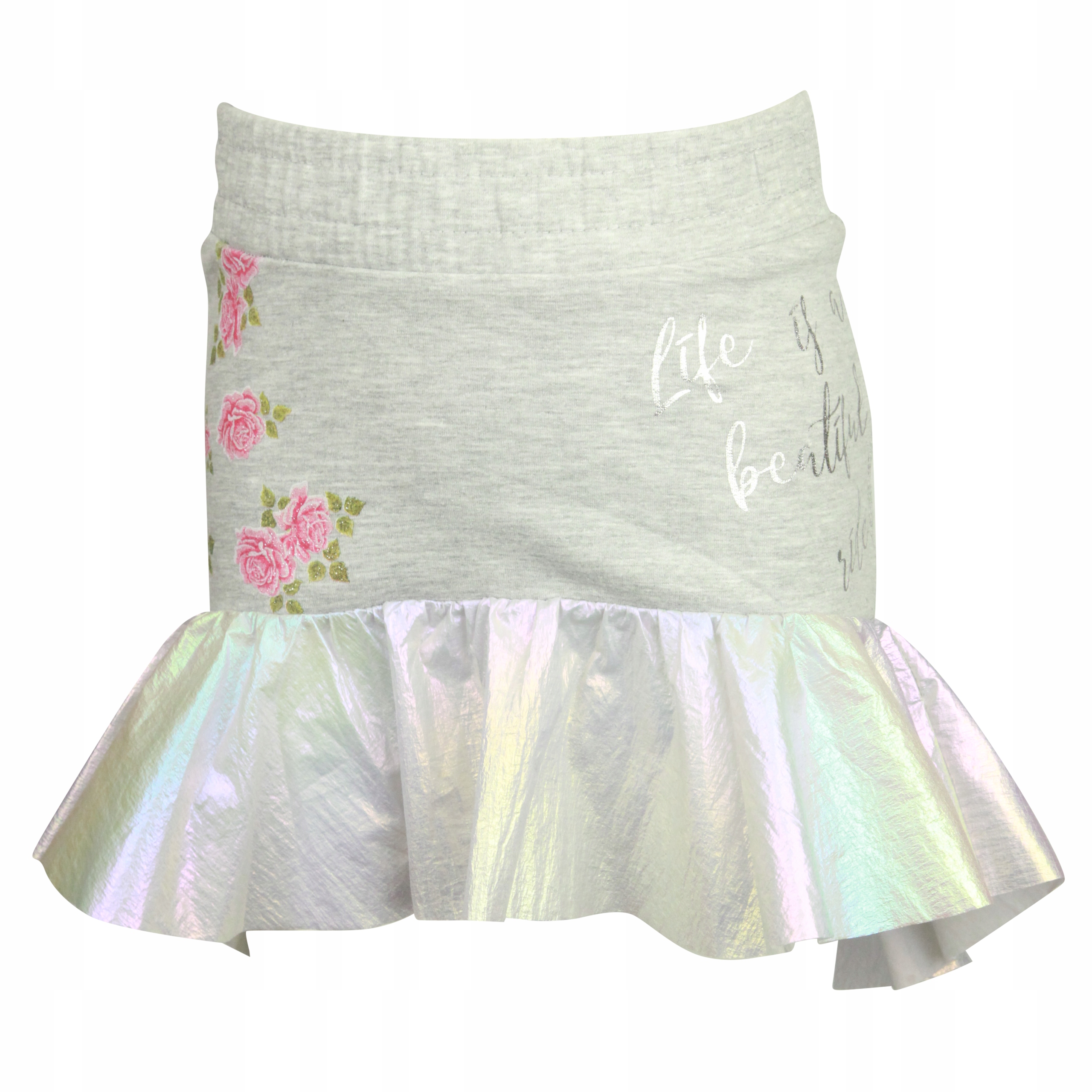 Рюші з голографічного матеріалу. Ніжний принт у вигляді троянд і напису.