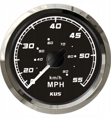 Спідометр з чорним циферблатом і рамою з нержавіючої сталі (AISI316) діаметром 96 мм. Годинник показує швидкість в діапазоні 0-55 миль/год або 0-90 км/год. Годинник призначений для установок на 12 або 24 В.