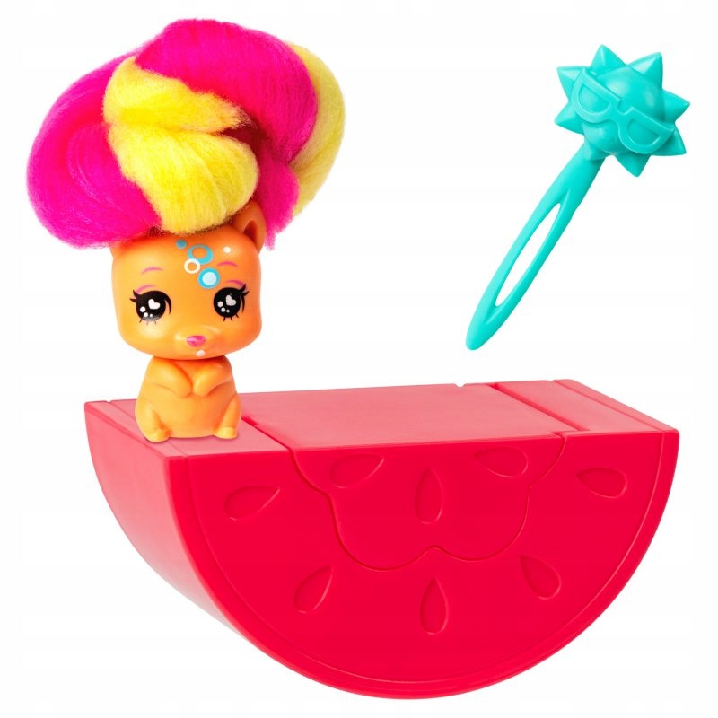 Унікальна текстура наддовгого волосся Candylocks Pets, натхненна цукровою ватою, полегшує укладання. Волосся зберігає форму і не розсипається. Створюйте коси, спіралі, хвостики тощо - можливості зачісок безмежні! Всередині упаковки є один аксесуар, який прикрасить казкові зачіски. Пограйте зі своїм улюбленцем на стильній грядці з кавунами або помістіть її всередину та візьміть із собою в подорож. Щоб отримати ще більше задоволення, додайте до своєї колекції ляльку Candylocks (продається окремо) — у цих чарівних ароматичних ляльок довге волосся з ароматною солодкою ватою, як у тварин!