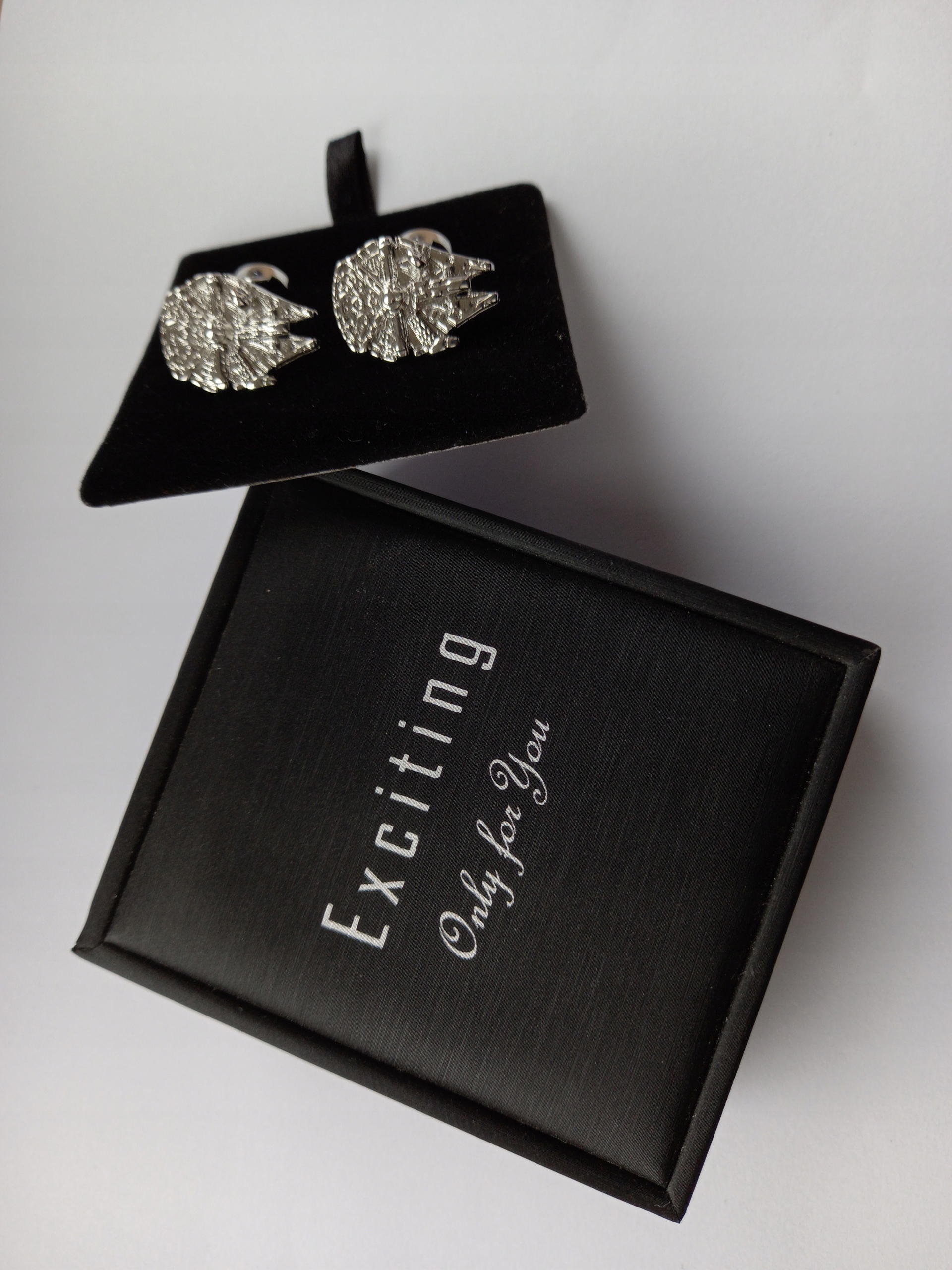 Оригінальний набір сорочкових запонок зі сплавів дорогоцінних металів та акрилових емалей. Набір з пари шпильок у стилі "Зоряних війн", автомобіль "Тисячолітній сокіл", виготовлений нашою фабрикою шпильок, як оригінальний дизайн з лімітованої серії "Тільки для тебе" Тільки для тебе та упакований в ексклюзивний футляр для шпильок.
