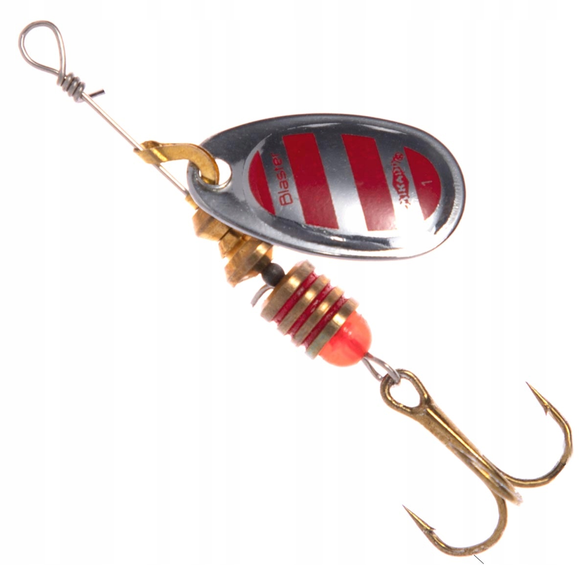 Сріблястий бластер з червоними смугами — це блешня з крилами середньої ширини листа. У такій конструкції він обертається під кутом 45 градусів, що робить його однією з найбільш універсальних приманок в нашій пропозиції окуня. Дуже добре працює восени та під час повільного витягування. Ідеально підходить для риболовлі як на річках, так і в стоячих водоймах. Сріблясте крило з додатковим червоним акцентом стимулює окунів і форелей ставати більш агресивними та атакувати.