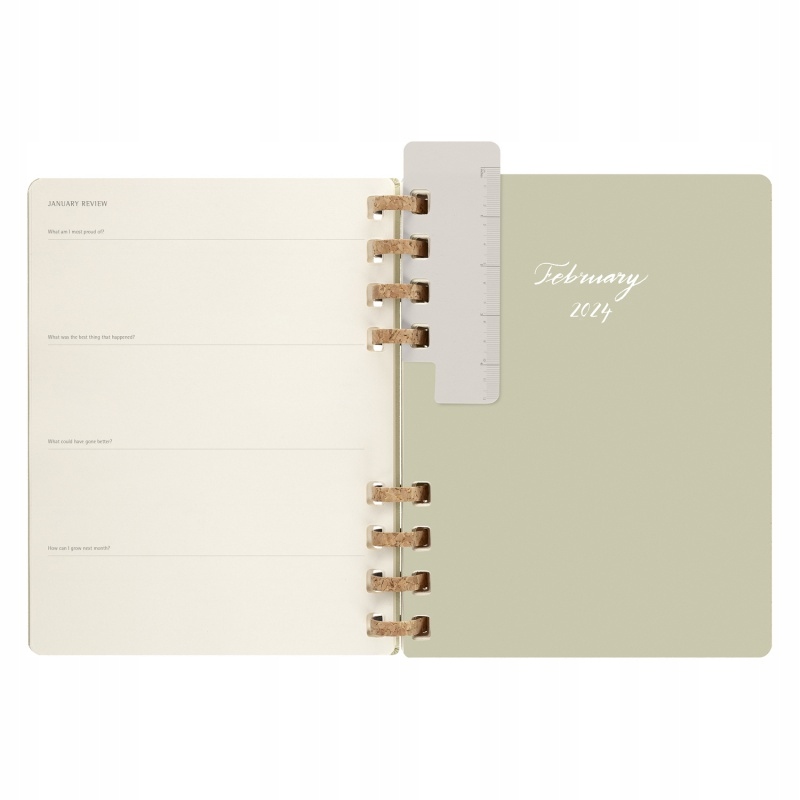 - Кожен місяць починається з місячного календаря, у якому висвітлюються довгострокові події та проекти, а кожен тиждень швидко відображається на двох сторінках із щоденними деталями, справами та ідеями.