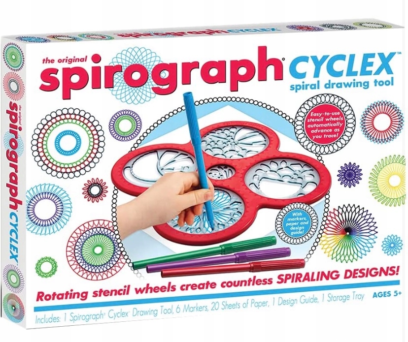 1 спірограф, 6 ручок, 20 аркушів паперу, 1 посібник, 1 контейнер для зберігання