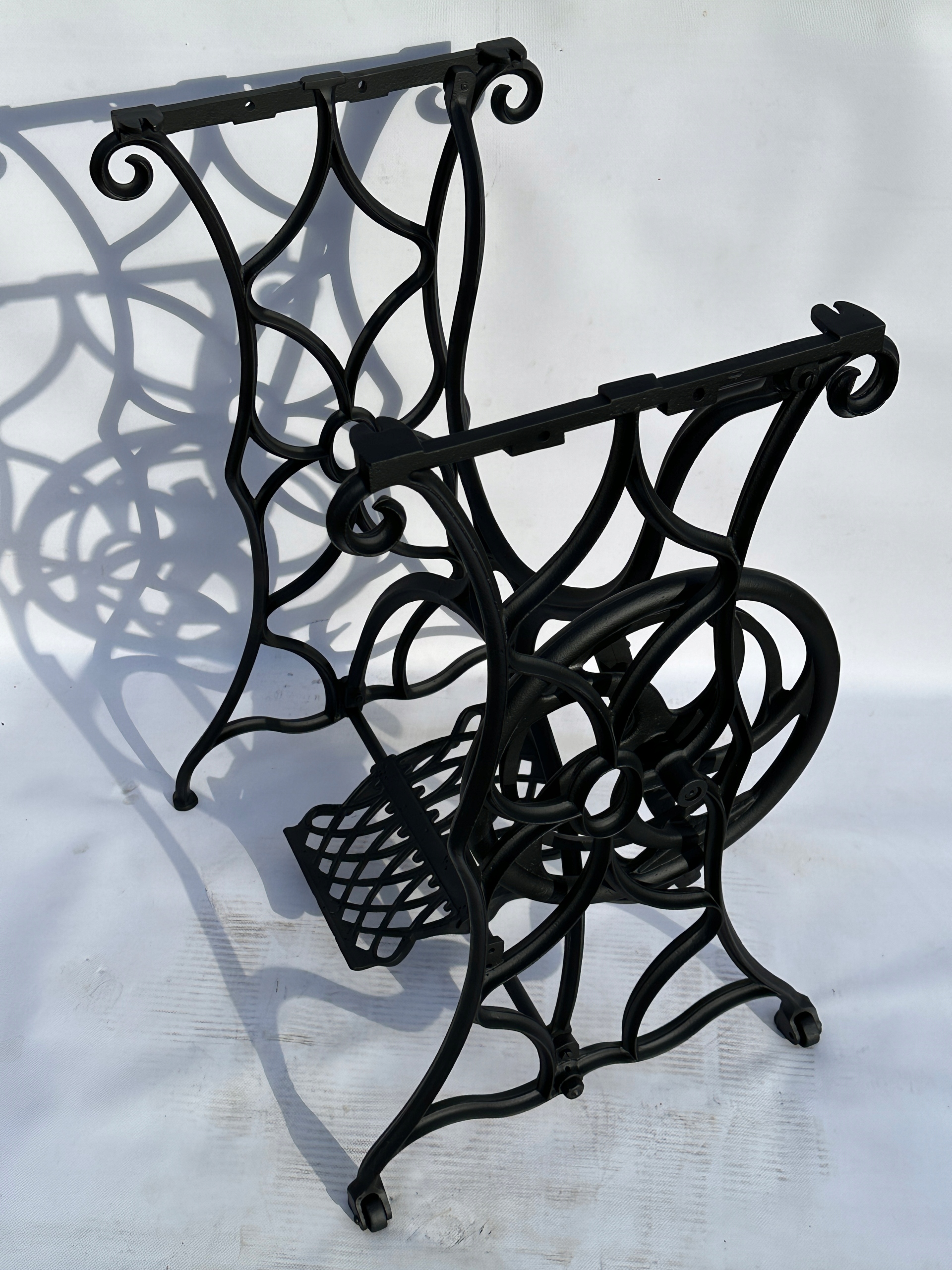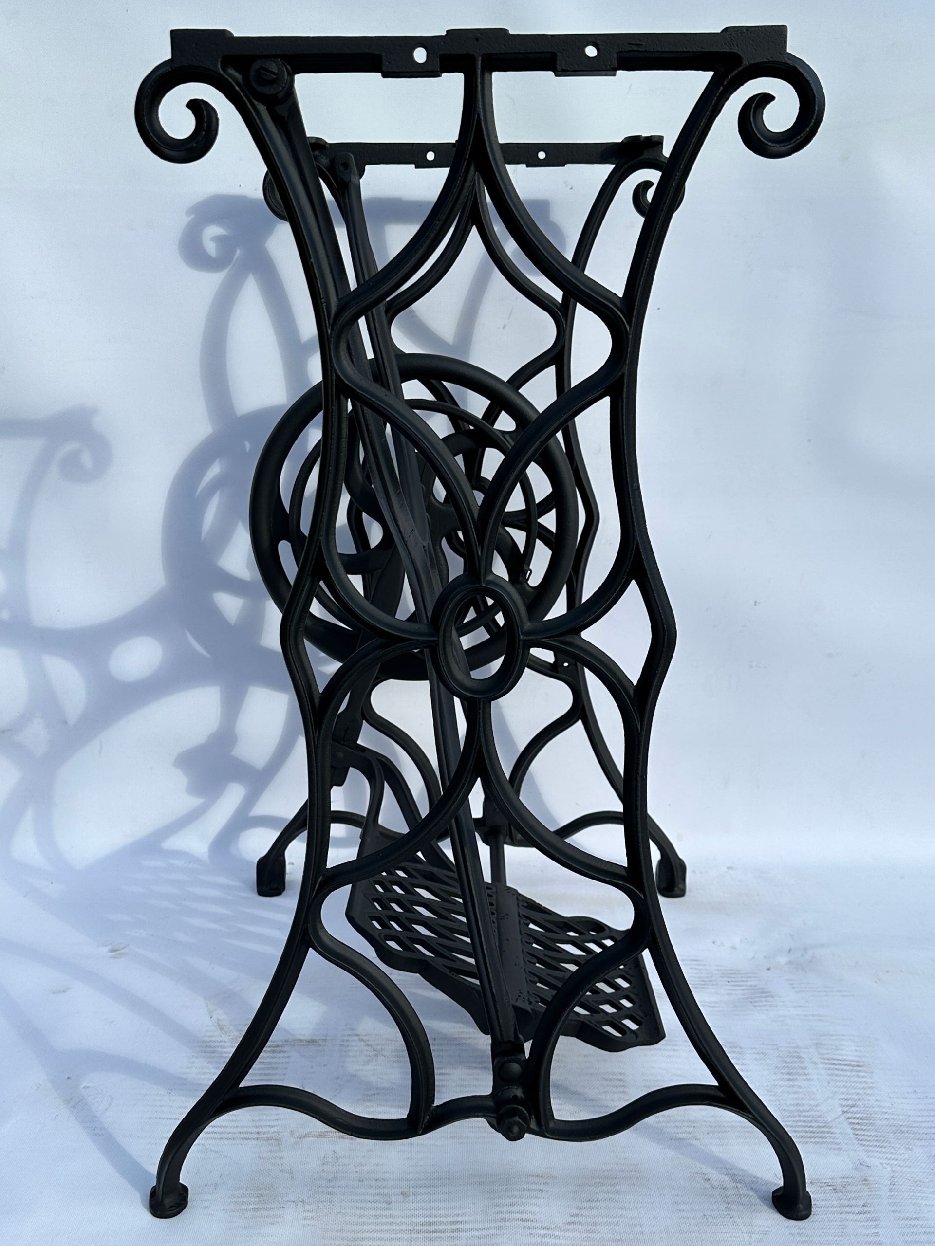 Тема продажу - це стара чавунна основа від швейної машини Singer. Дуже приємний малюнок з квітами з боків, рідше. має обидва колеса в нижній частині. 75,8 см (висота)