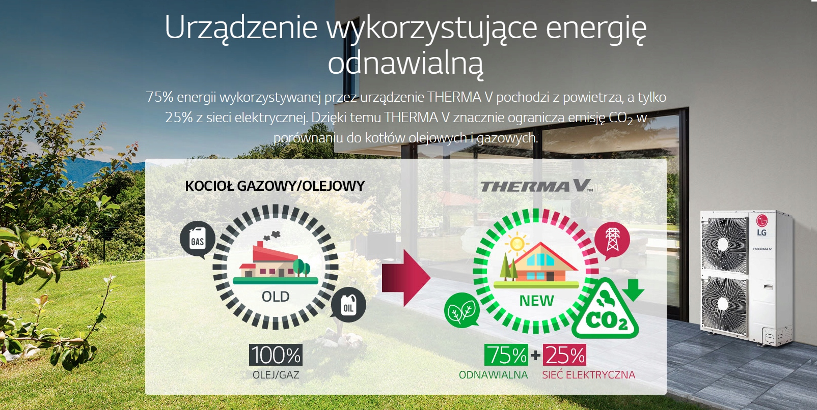 THERMA V дозволяє ефективно обігріти внутрішню частину вашого будинку чи квартири завдяки використанню відновлюваної енергії з повітря зовні, навіть при низькій температурі. Завдяки поєднанню принципів теплового насоса з інверторною технологією LG ефективність COP системи Therma V становить від 4,1 до 4,5, що дозволяє отримувати понад 4 кВт теплової енергії, використовуючи 1 кВт електроенергії. Завдяки цьому споживання енергії фактично нижче, ніж у випадку інших систем опалення, таких як електричні обігрівачі або газові або масляні котли.